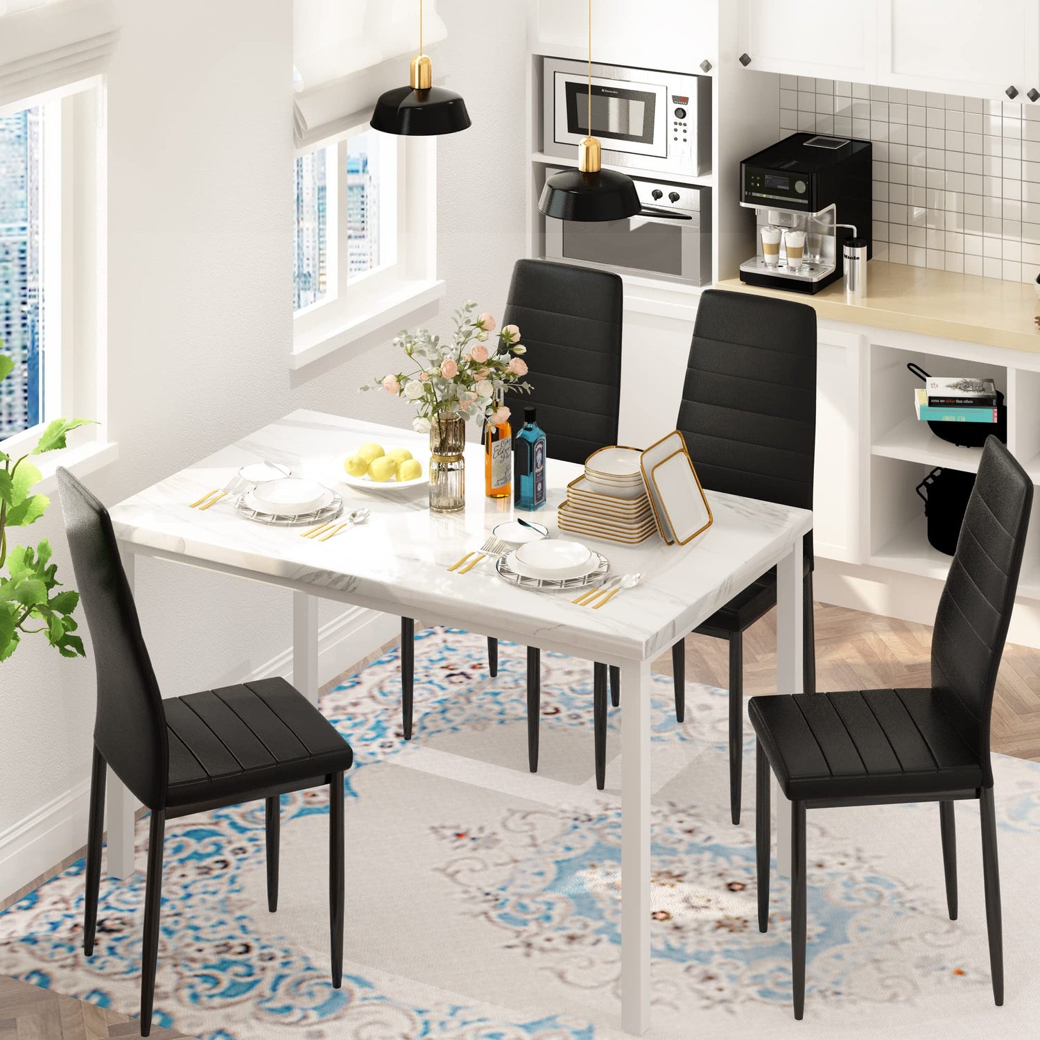 - 【5 Piece Dining Table Set】This dining table set made of high-quality MDF material, and the surface is covered with faux marble makes cleaning the easier. The whole set of marble tableware does not contain harmful substances and gases. You can eat and work at the table with confidence. There is no need to worry and enjoy this durable kitchen table set for several years.