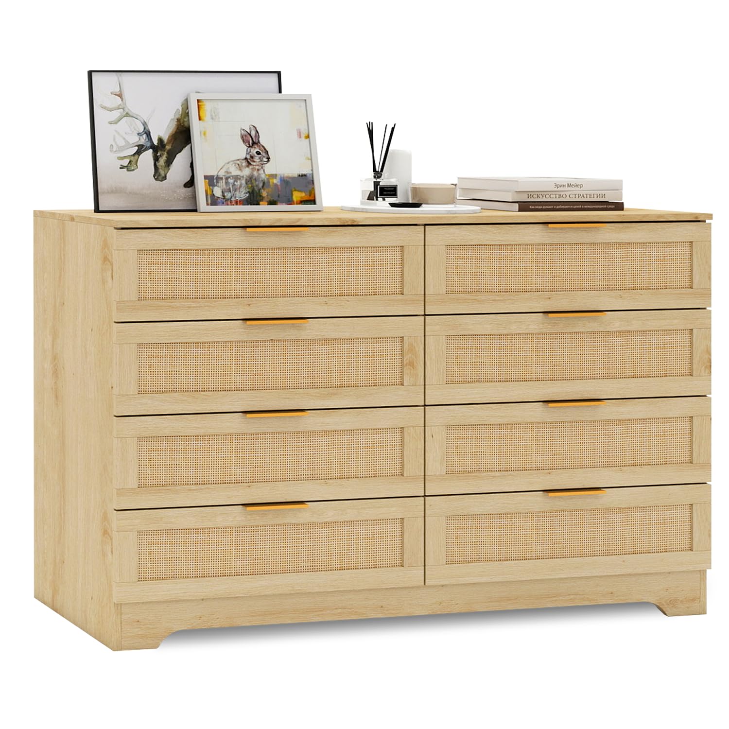 HOPUBUY 8 Drawer Dresser for Bedroom, Rattan Modern Closet Dressers Chest of Drawers, Boho Wood Double Wicker Dresser Storage Closet for Bedroom, Living Room, Entryway (Natural)