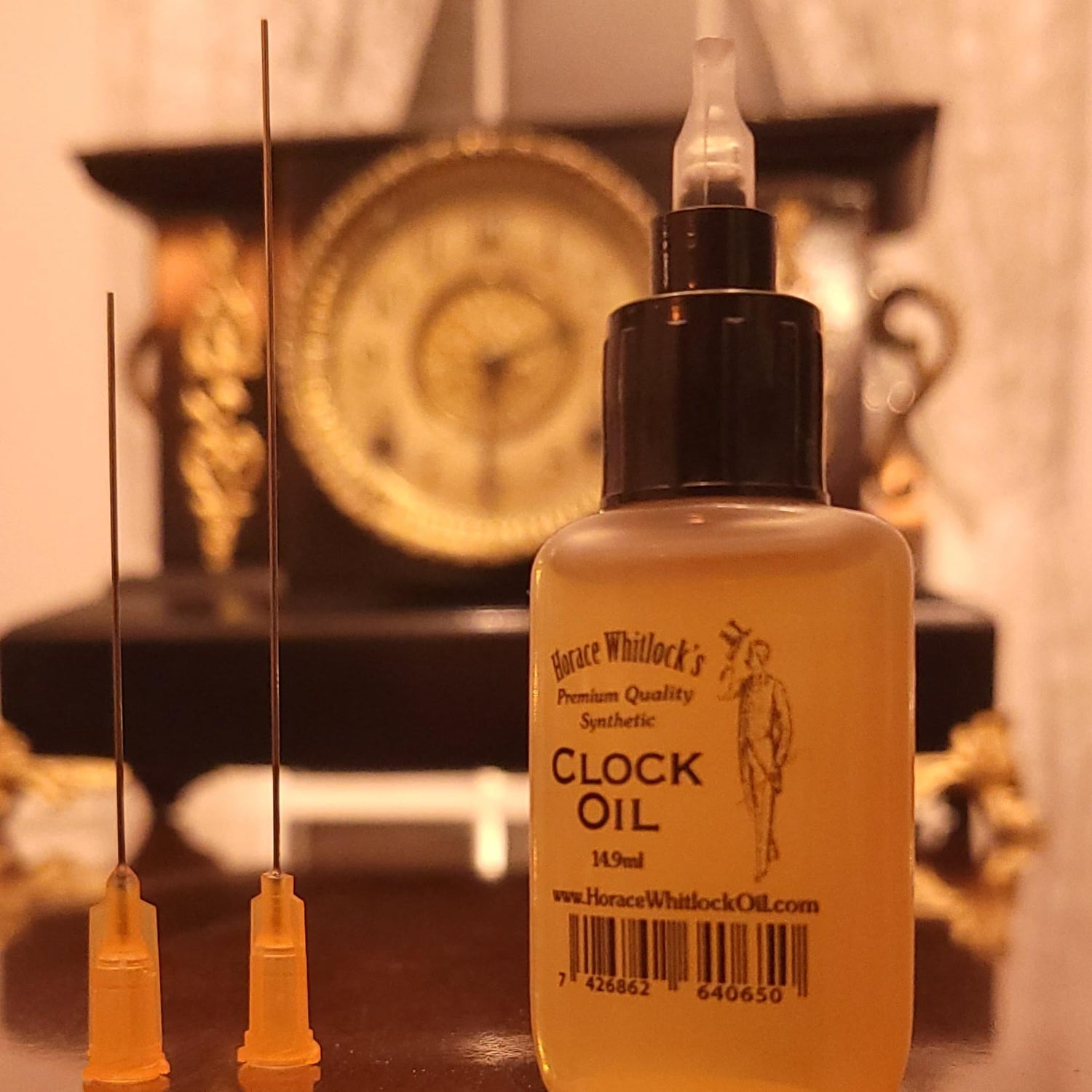 Details: Inside your package you will find the following items: (1)-15 ml Squeezable bottle of Horace Witlock's premium quality synthetic clock oil ( there is enough oil in this bottle to oil 50-75 clocks or more) (1) 2" inch and (1) 3"23 gauge blunt end needle (1) Luer lock bottle cap (1)-rubber tip needle end caps. Horace Whitlock's clock oil is a fully synthetic blend of oils, with the perfect properties for servicing and maintaining you antique, vintage and modern day mechanical clock. This clock oil has been perfectly blended for the best viscosity for all clocks. Horace Whitlock's clock oil will allow your clock to perform at peek performance for many years. This oil has been tested on over 3,000+ clocks in the past 10+ years. All Horace Whitlock oil's where designed for and sold to the professional clock repair shop and now has been available to the hobbies since the end of 2018. You wont find a better quality clock oil anywhere. This synthetic clock will not gum up, dry out or collect dust like most oils will. This clock oil is also safe on all plastics parts. Horace Whitlock Clock oil is specifically designed not to soften lacquer or varnishes and this oil has an extremely long shelve life. Our clock oil is now available in a squeezable bottle and comes with (1) 23 gauge Luer lock needles and a luer lock cap. This 23 gauge needle will allow the user to apply the perfect amount of oil where it is needed. Larger gauge needles (14-20 gauge) typically will deposit too much oil on the clocks movement, allowing for the oil to run down the side of the movement and drain out of the pivot. See the photo of the oil deposited on a backdrop. The smaller is from our 23 gauge needle and the larger drop is from a 20 gauge.