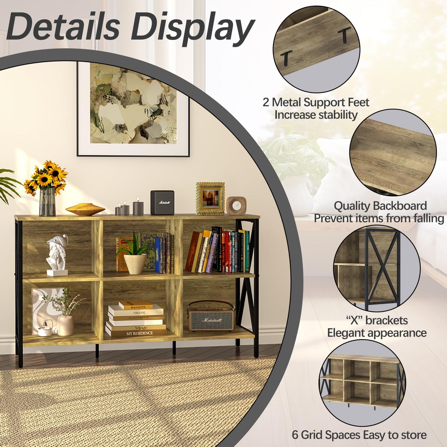 - [6-Cube Storage Organizer Wide Bookshelf] Low horizontal bookcase combination of rustic oak board and black metal frame flawlessly blends modern and traditional styles. The farmhouse-inspired design adds a charming rustic touch to your space, bring an industrial touch to your home.