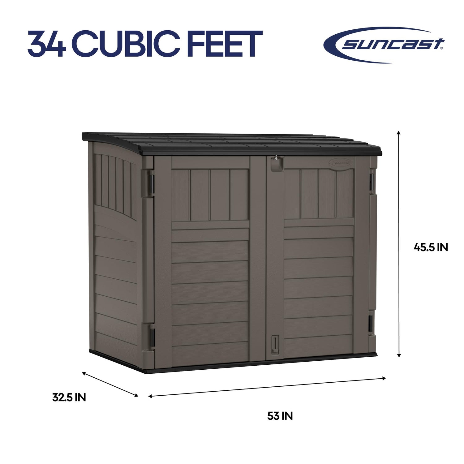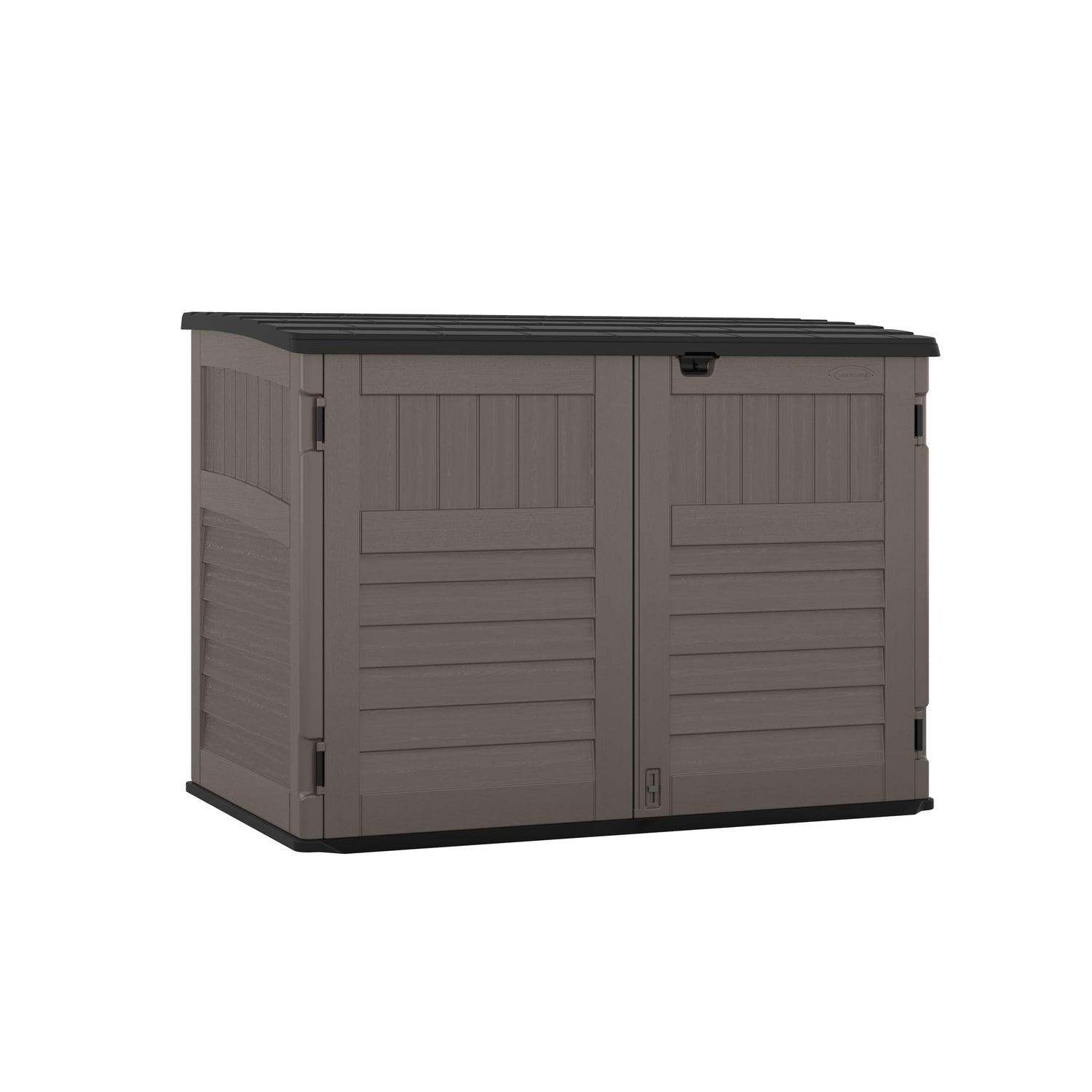 Details: At 70 cu. ft., this Horizontal Shed by Suncast® is the perfect solution for hiding your unsightly garbage cans and organizing your lawn and garden equipment. The storage space is sufficient for holding up to two – 96 gallon waste containers or it can house other items such as furniture cushions, bicycles, firewood, and gardening supplies. Two front-opening doors along with the top-loading lid allow easy access to your items. Gas shocks assist for a one-handed lift operation and ensures that the lid will stay open while in use. Additionally, this horizontal shed has a soft-close hinge that is designed to prevent the lid from closing too quickly or slamming shut. Constructed of steel-reinforced, multi-wall resin, this durable shed is built to withstand the elements throughout any season.