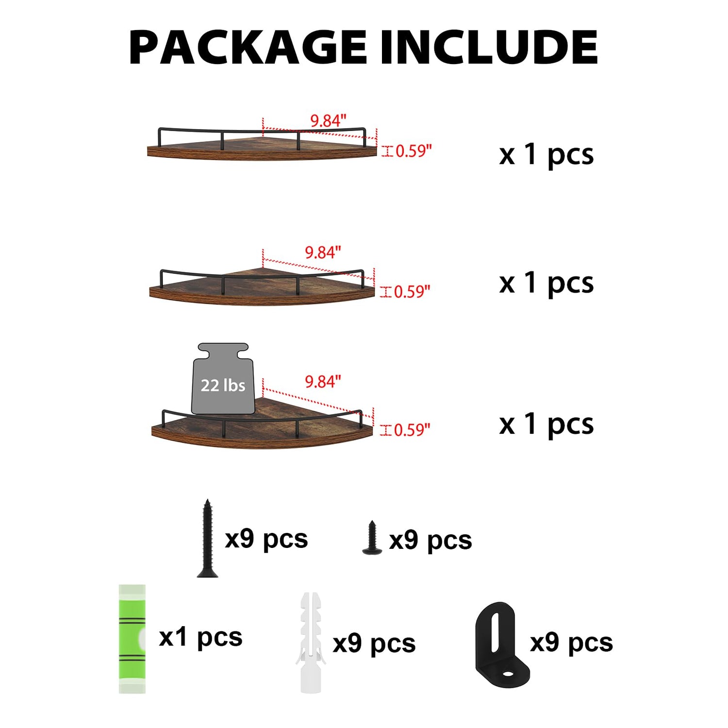 - 3 PACK CORNER SHELVES: The package comes with three same-sized corner shelves: 9.84 x 9.84 x 0.59 inches(25 x 25 x 1.5 cm). Create shelving space around your whole home with this corner shelf set.