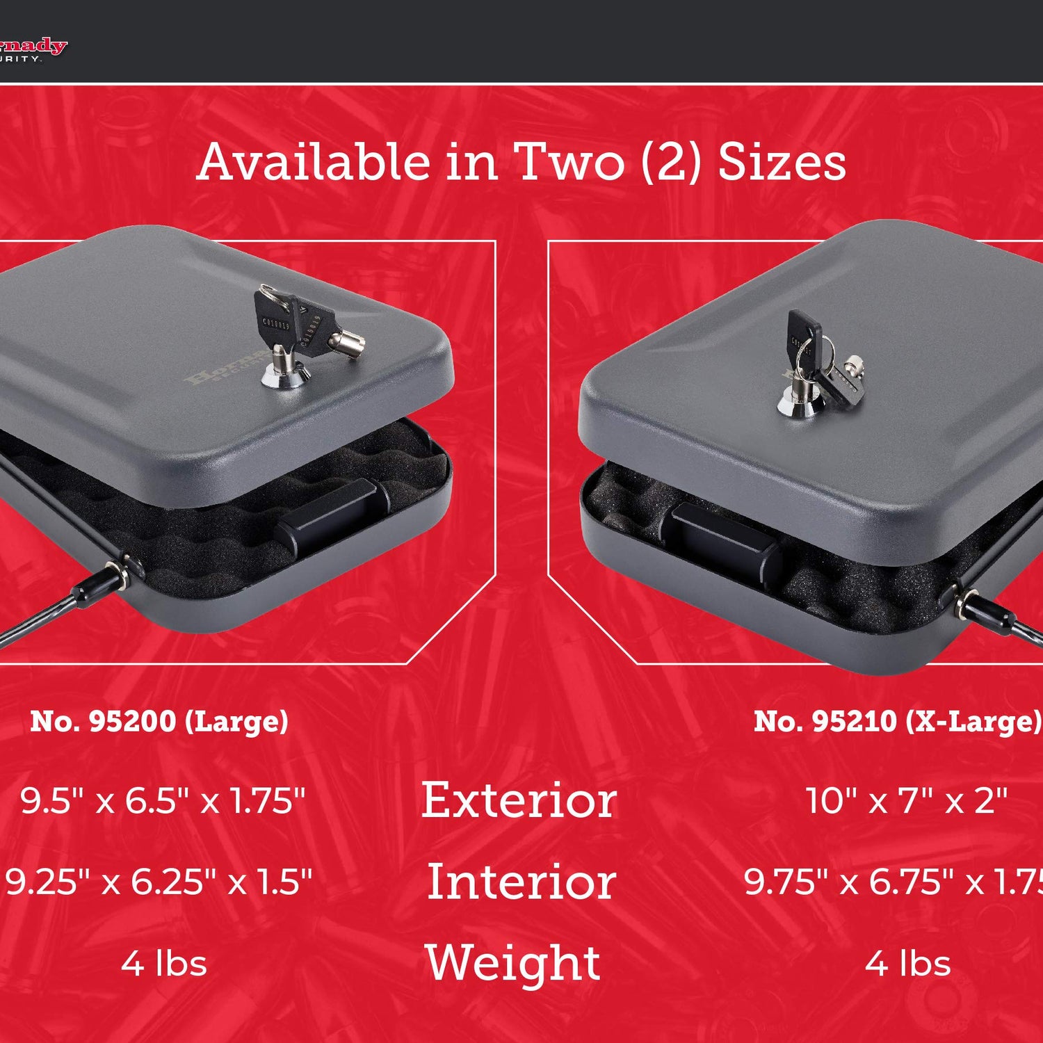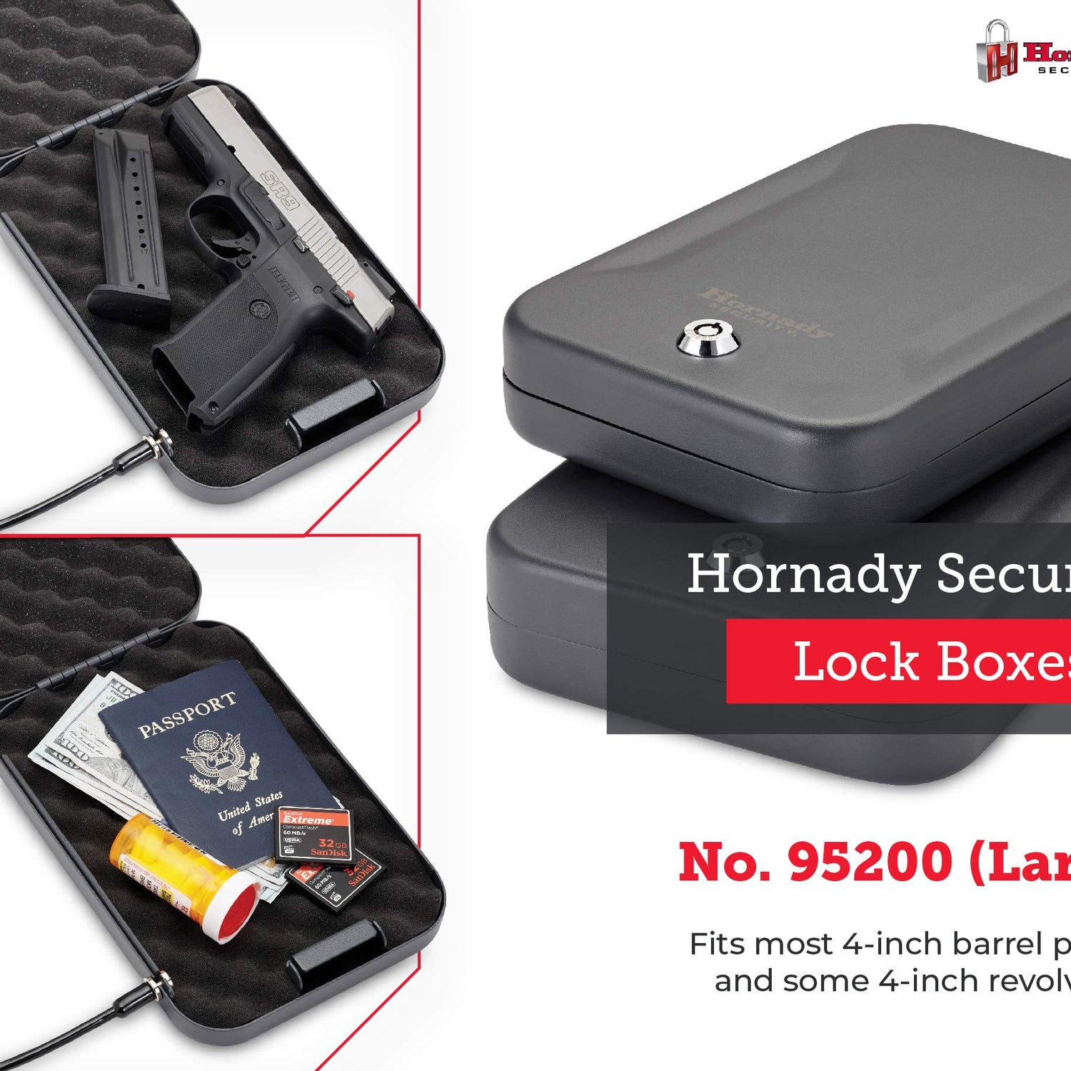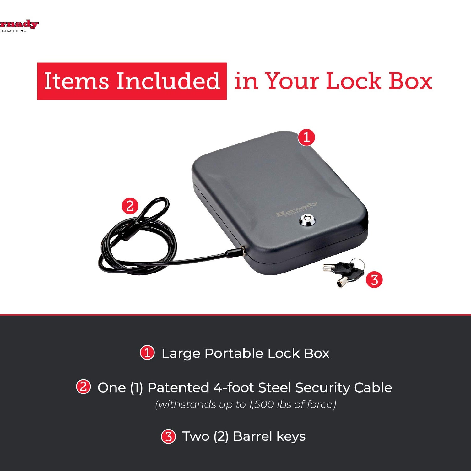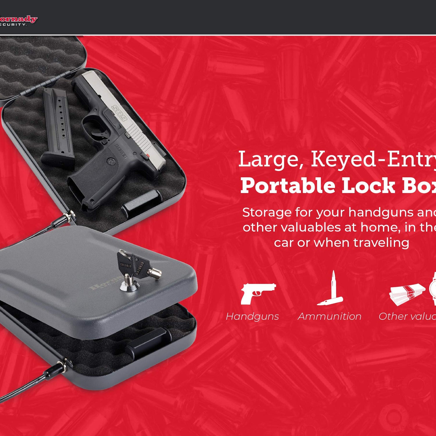 - Hornady Lock Box – Store your firearm and valuables with confidence. This large locked storage box provides a safe and secure place for your handguns and other valuables at home, in the car or when traveling