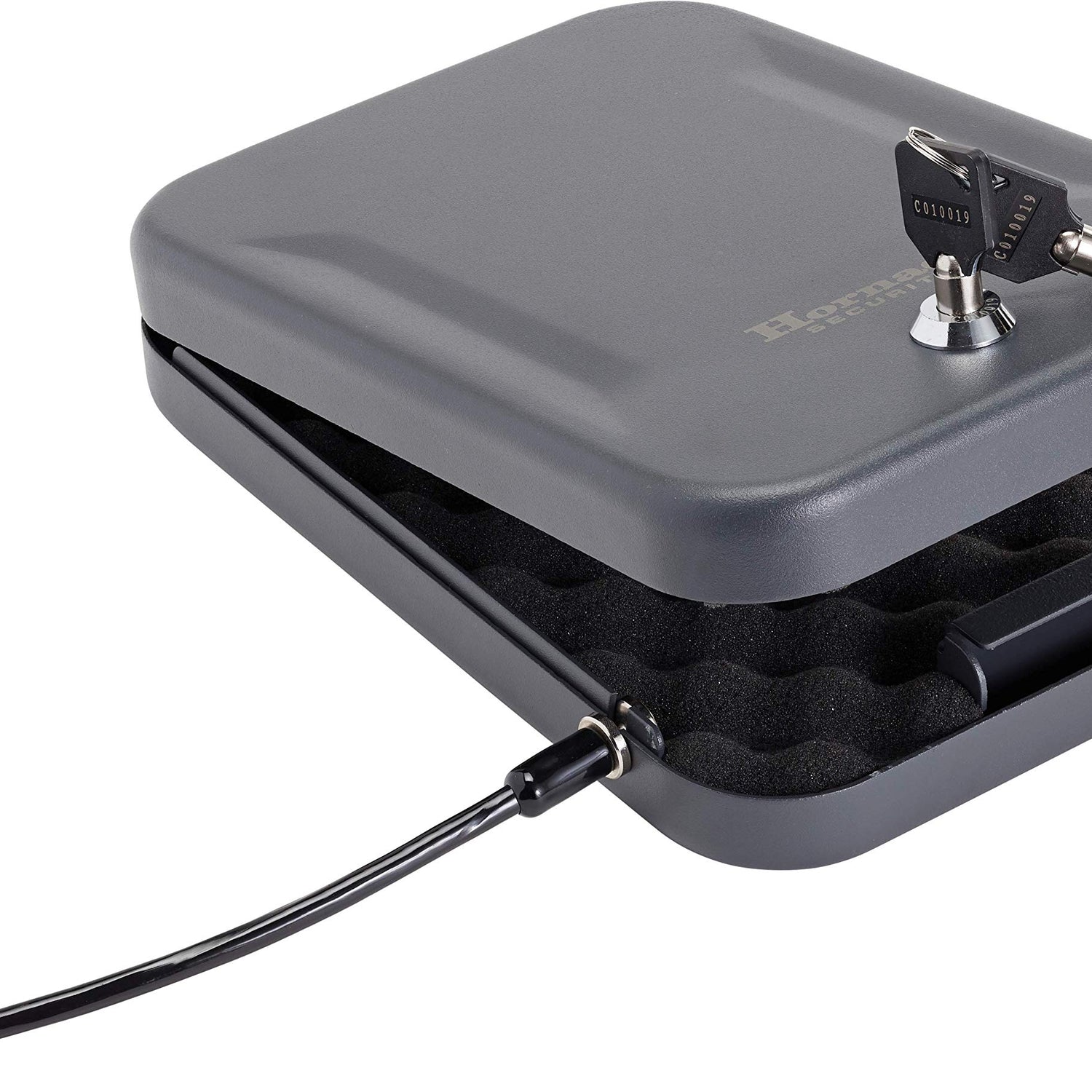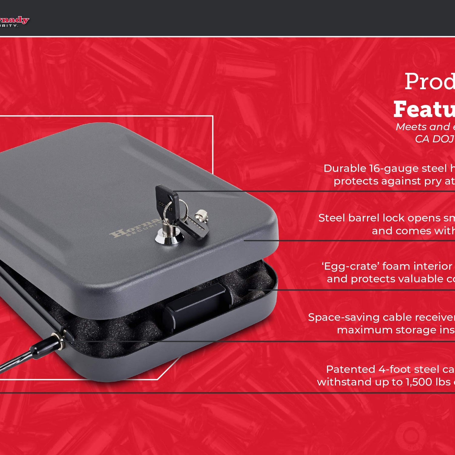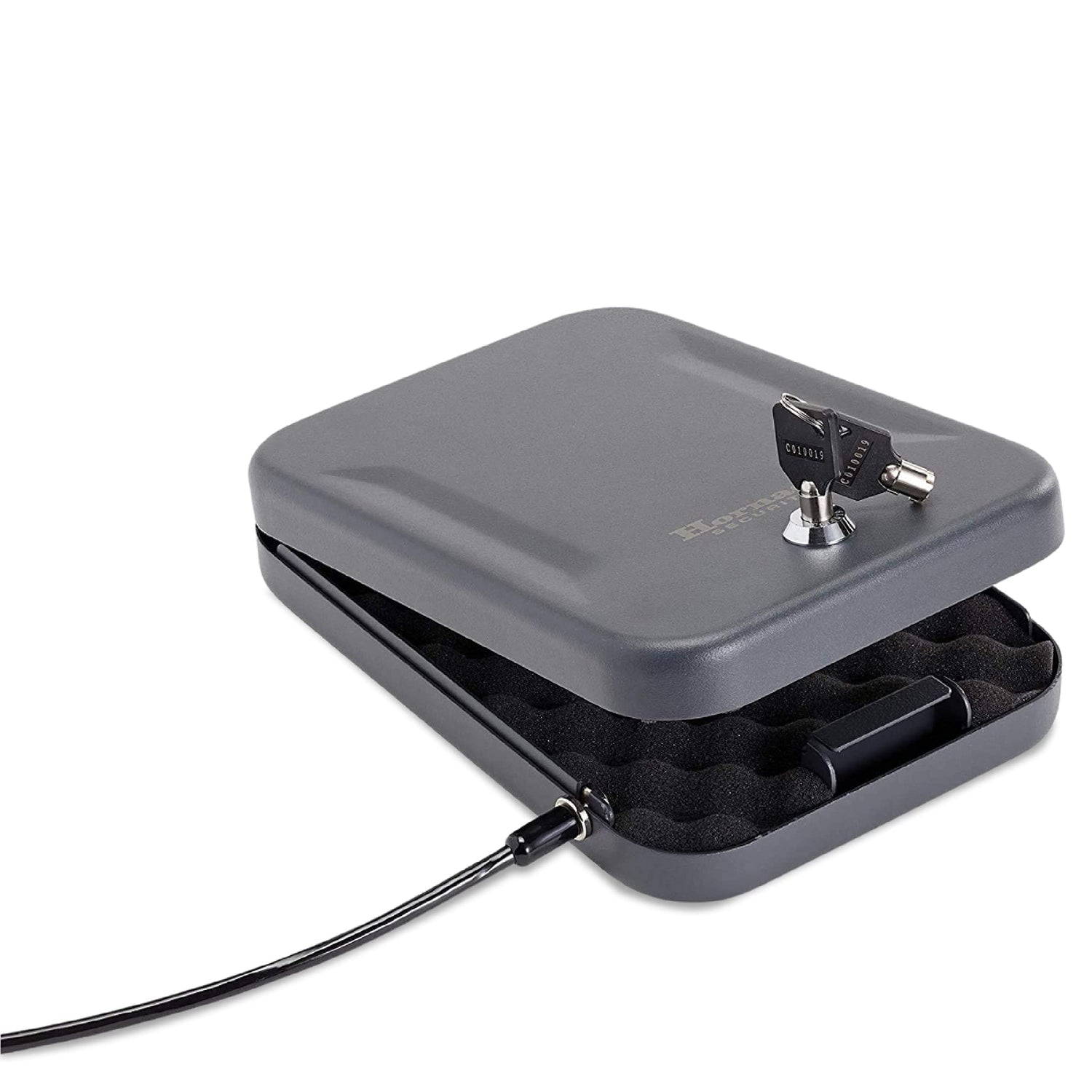 - Heavy and Sturdy – This Hornady safe is made from 16 gauge steel. Comes with a heavy duty 1500 lb. steel lock-down cable that attaches the portable safe to any stationary object, including a vehicle seat or heavy piece of furniture