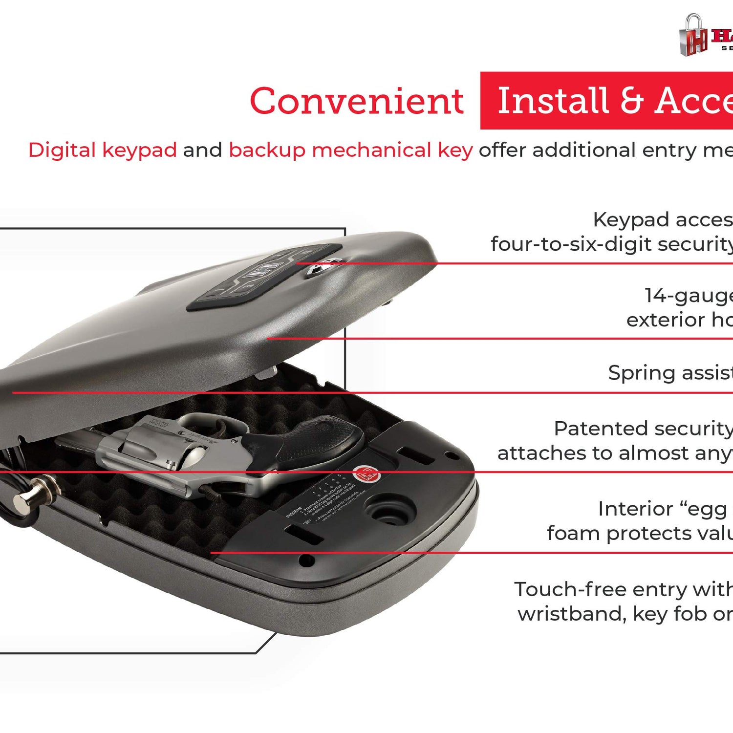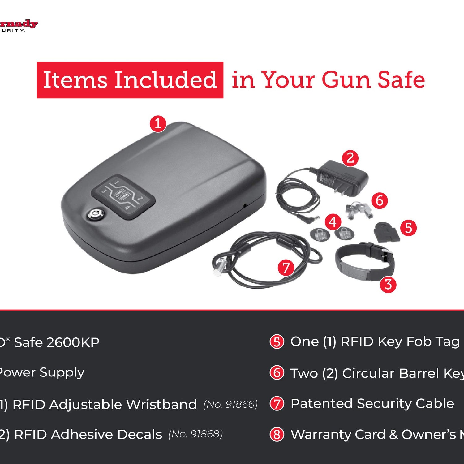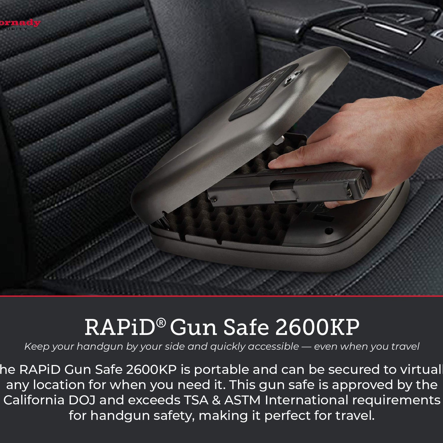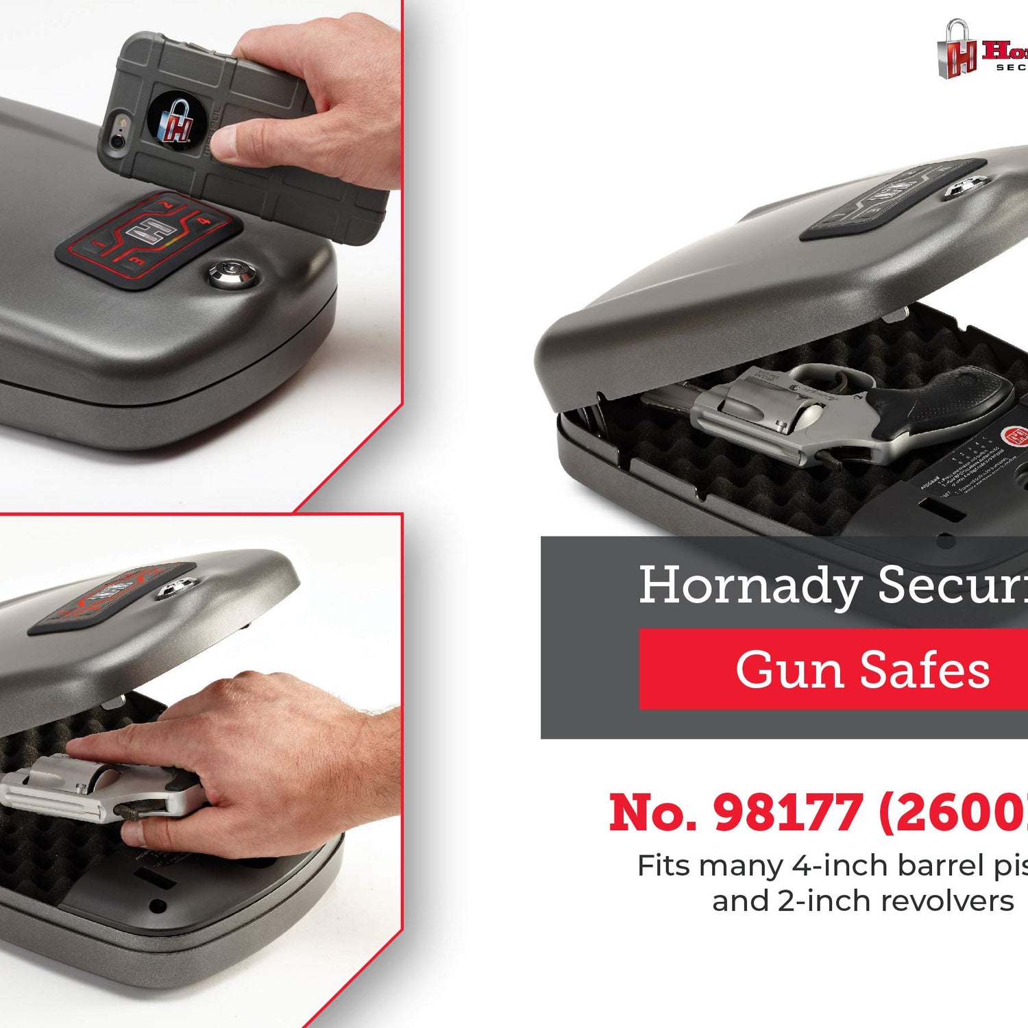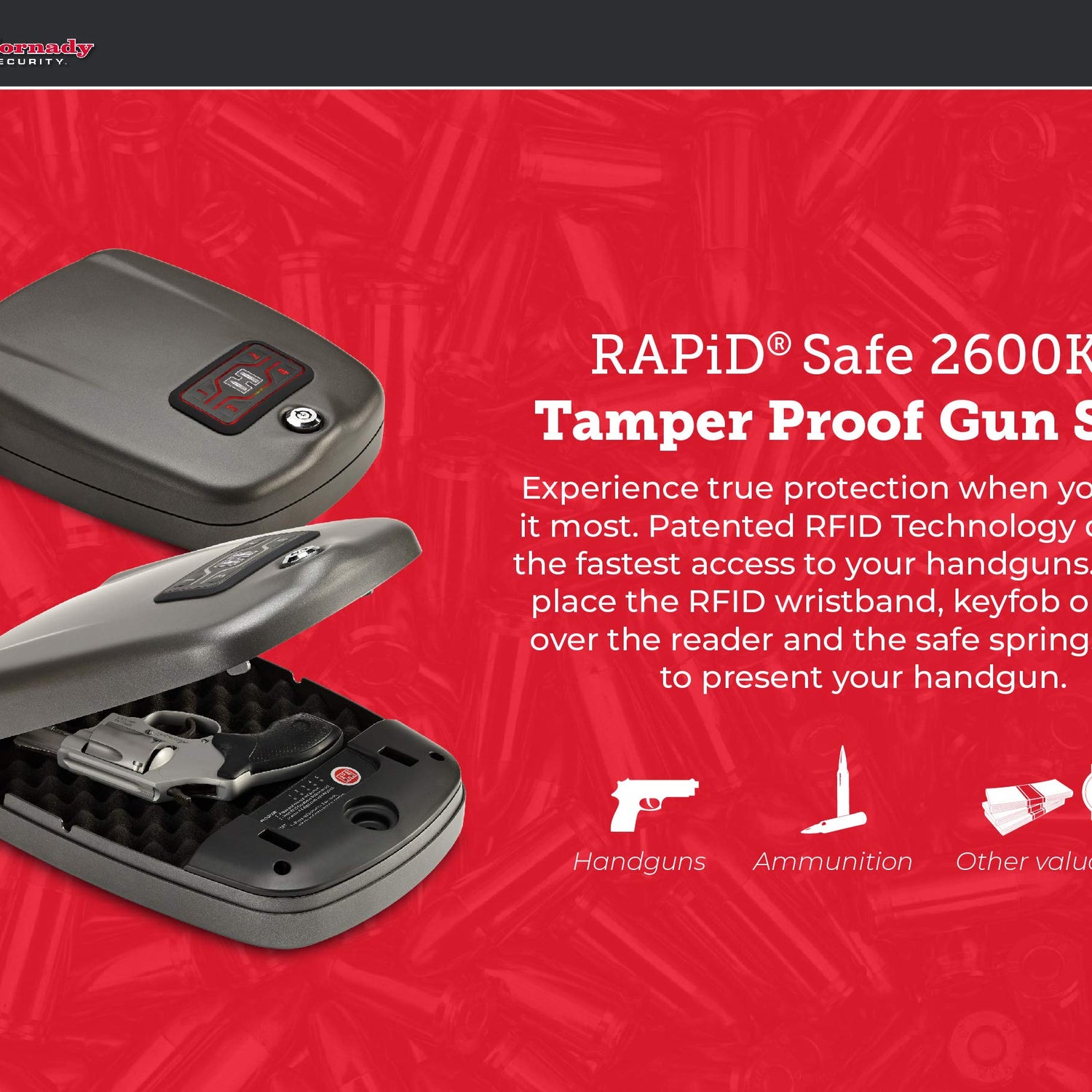 - Hornady Rapid Safe 2600KP – Patented RFiD technology delivers the fastest access to your handguns. Touch-free entry opens the RFiD gun safe instantly using the included wristband, key fob or decals. Experience true protection when you need it most