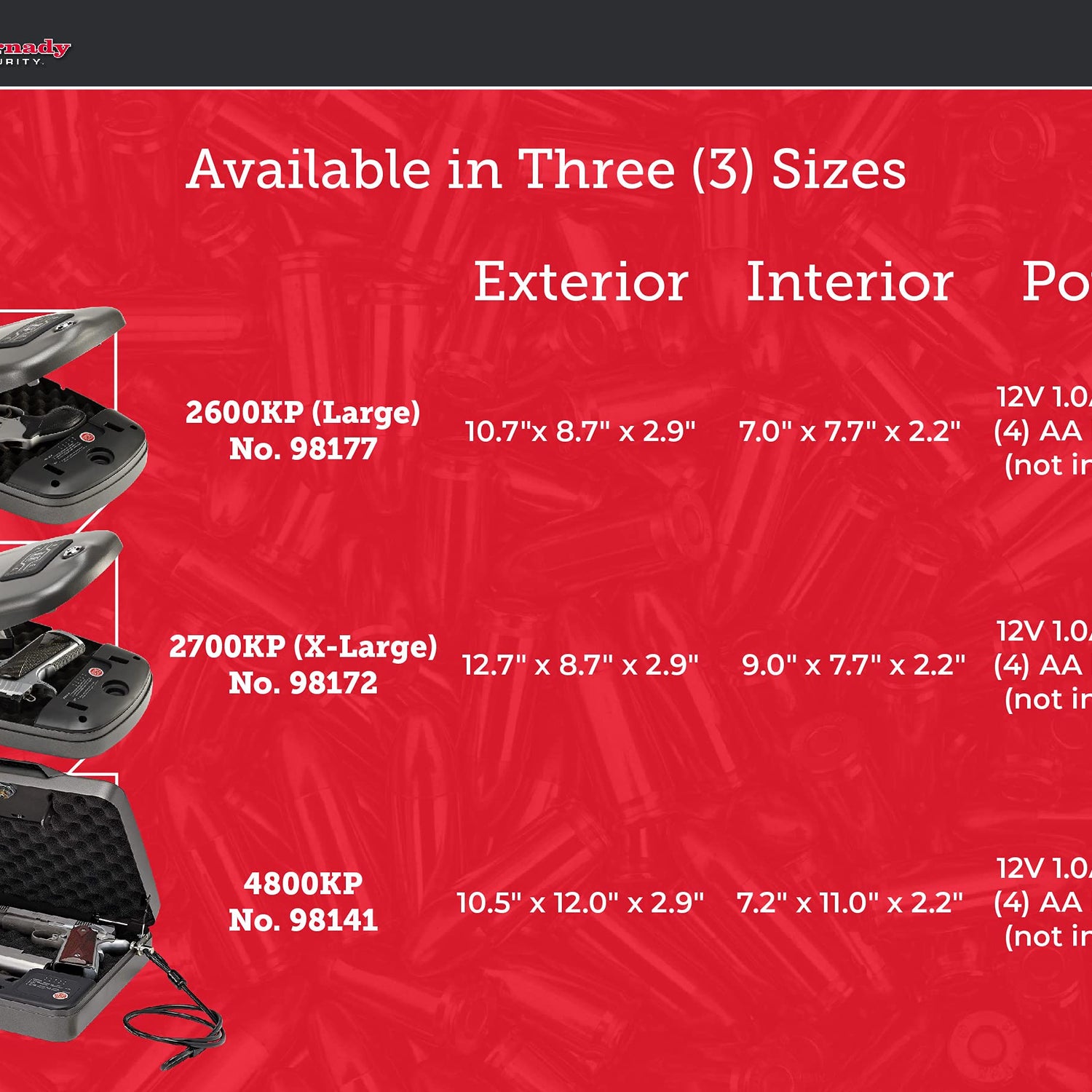 - Sizing and Specifications – Large size. Exterior: 10.7 x 8.7 x 2.9", Interior: 7 x 7.7 x 2.2". Fits many 4-inch barrel pistols and 2-inch revolvers. Includes Rapid Safe (2600KP), wristband, key fob, (2) decals, (2) circular barrel keys, 1500 lb. security cable and AC power cord