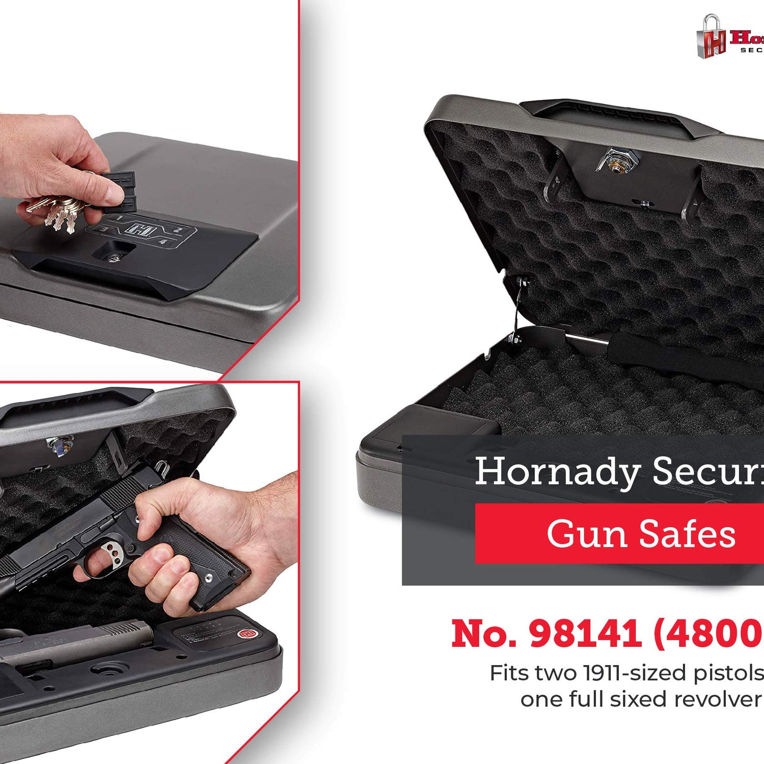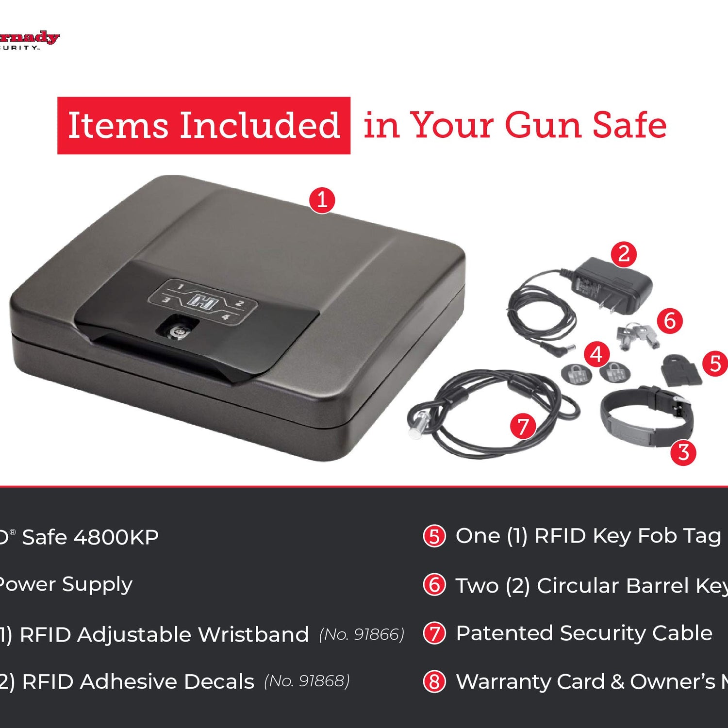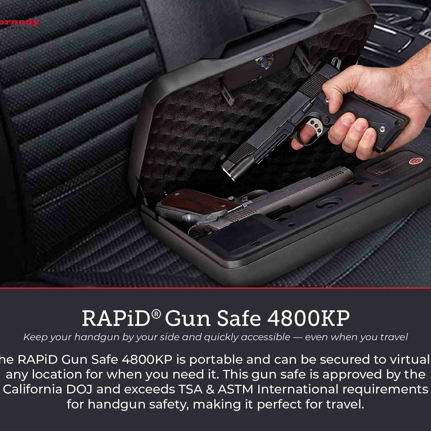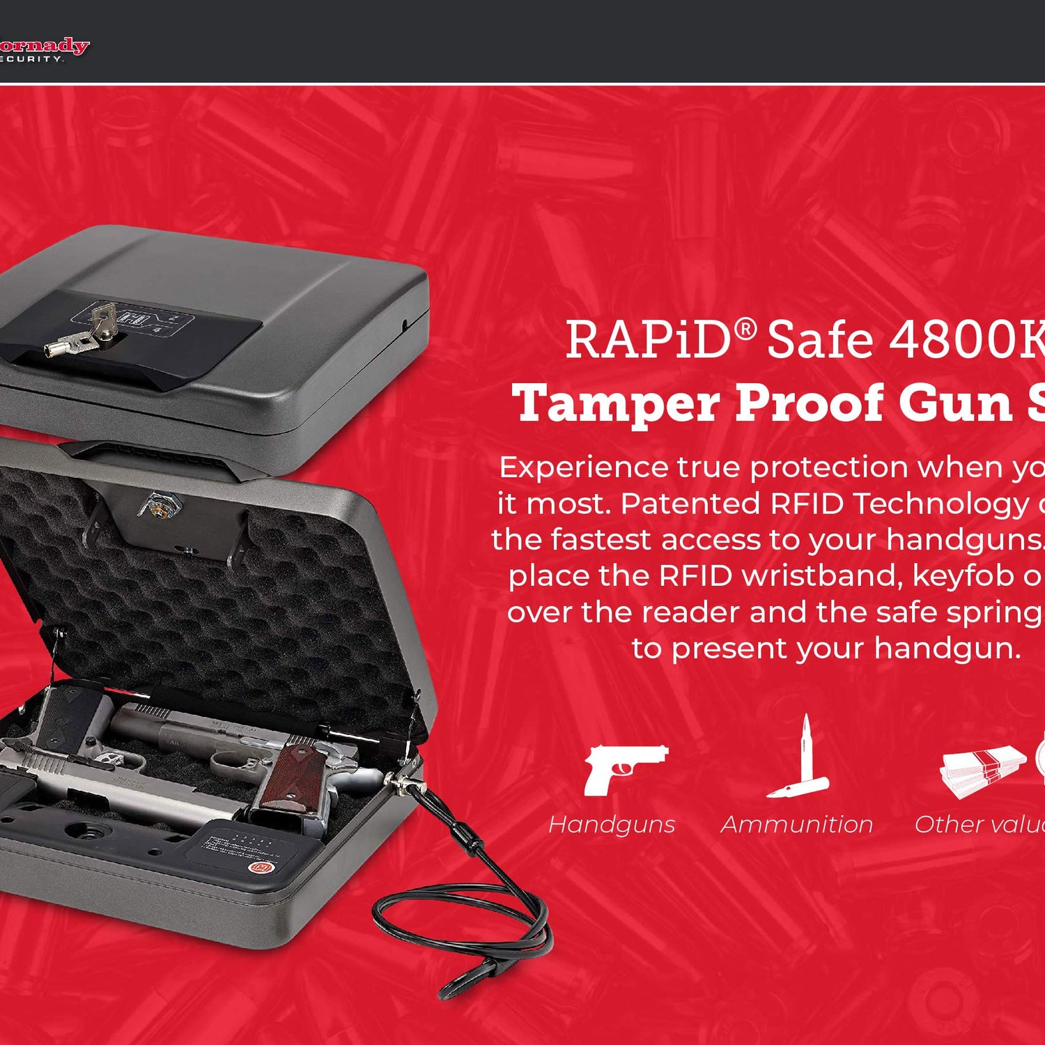 - Hornady Rapid Safe 4800KP – Patented RFiD technology delivers the fastest access to your handguns. Touch-free entry opens the RFiD handgun safe instantly using the included wristband, key fob or decals. Experience true protection when you need it most