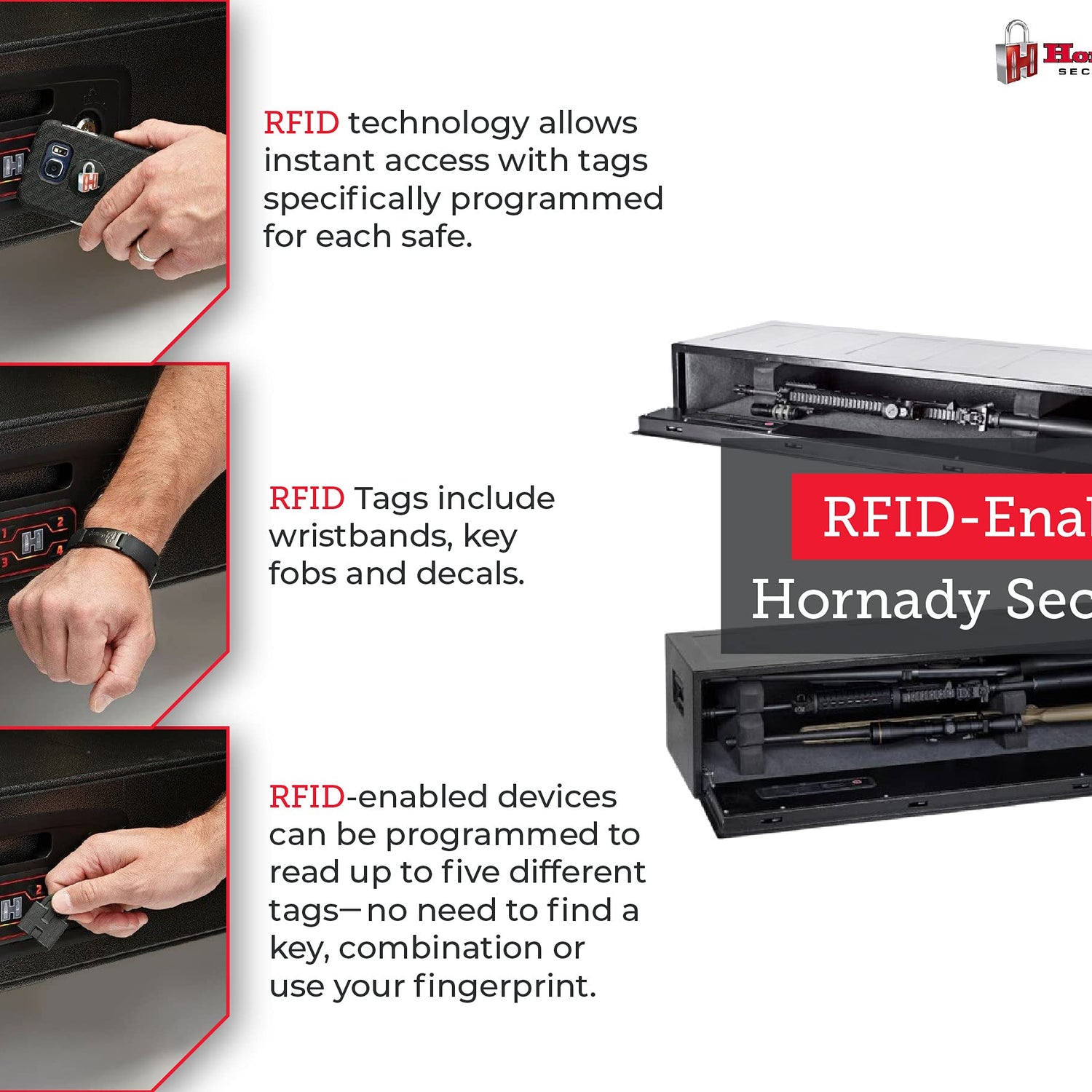 - TOUCH-FREE ENTRY RFID SAFE - rifle safes for home with patented RFID technology provides unmatched security from unauthorized users. Simply place the included RFID wristband, key fob or decal over the safe’s reader to immediately open and retrieve your firearm.
