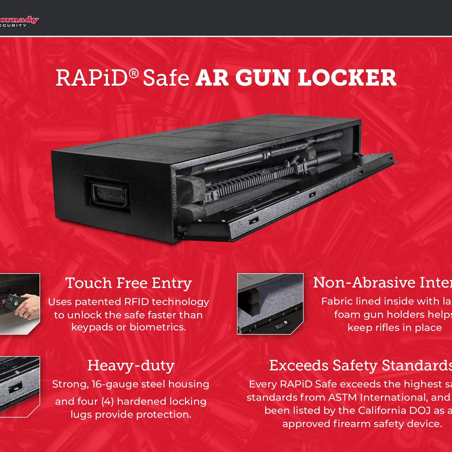 - CERTIFIED CHILD-RESISTANT - every Hornady security rapid gun safe exceeds ASTM International safety standards for child and pry resistance, lock strength, drop/pick/saw tests and hinge attack resistance. Confidently store and secure your gun safe accessories