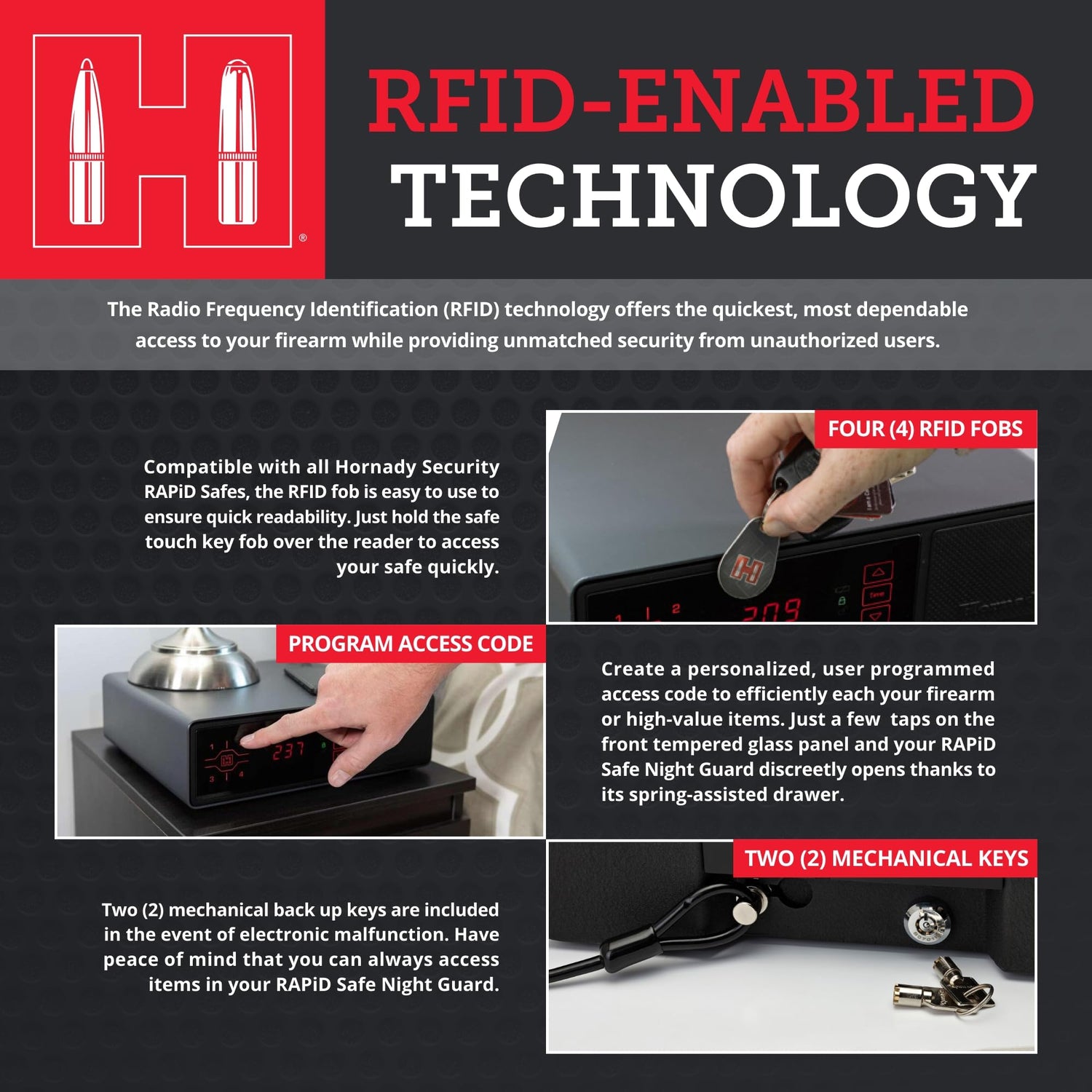 - Quick Access Gun Safe - This Hornady gun safe uses the patented RFID technology to unlocks safes faster than keypads and biometric gun safe for handgun. Four included RFID tags can be selectively programmed to open this safe and any other RFID gun safe you own.