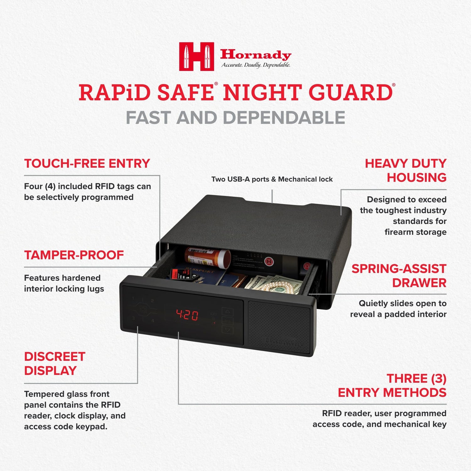 - Discreet, Secure, Touch-Free Entry - the Hornady Rapid Safe Night Guard, 98215 keeps your handgun safes for pistols as close as your nightstand. It's hidden in plain sight, plus the additional functionality of a clock and USB charging points, use it as your bedroom gun safe, living room safe, or closet safe