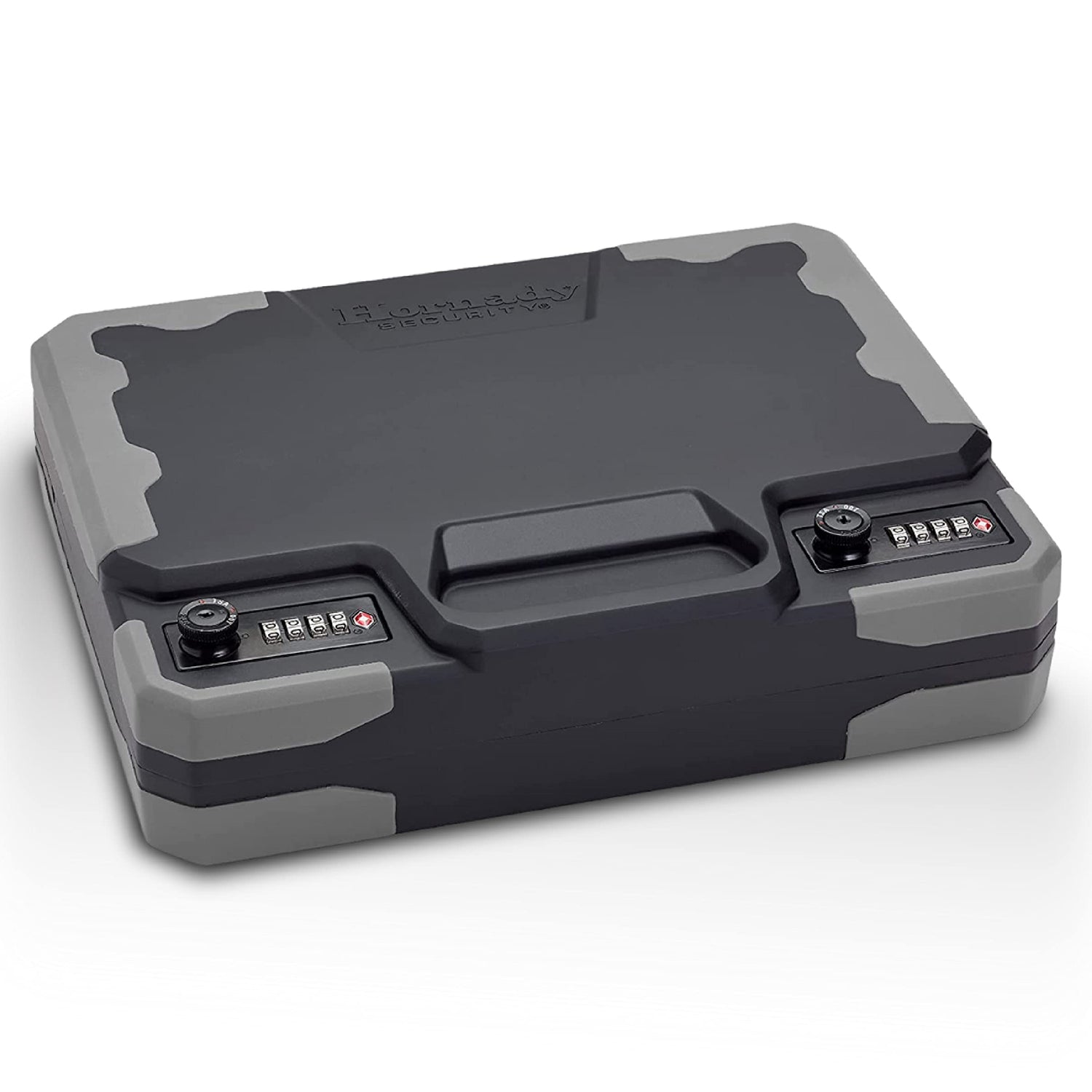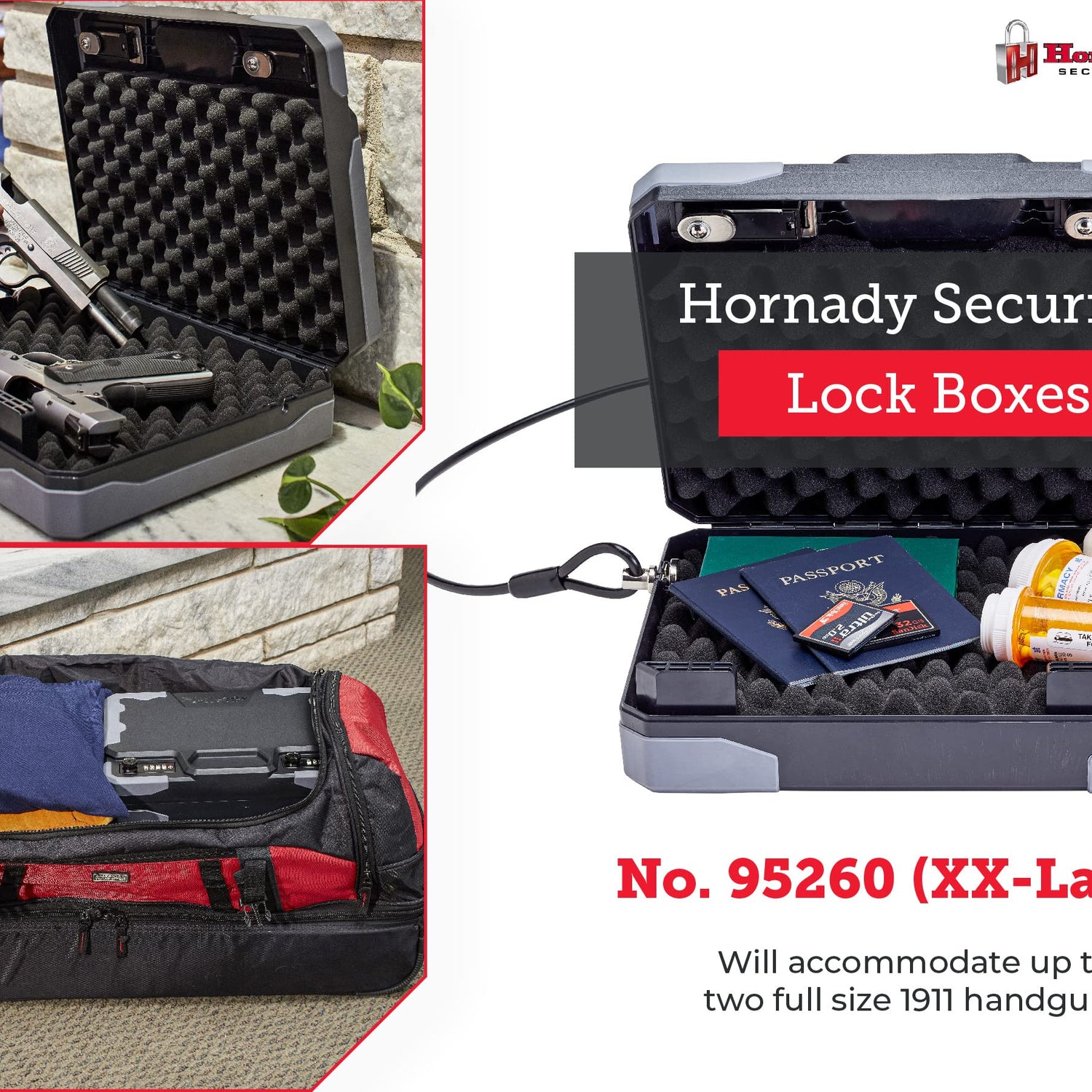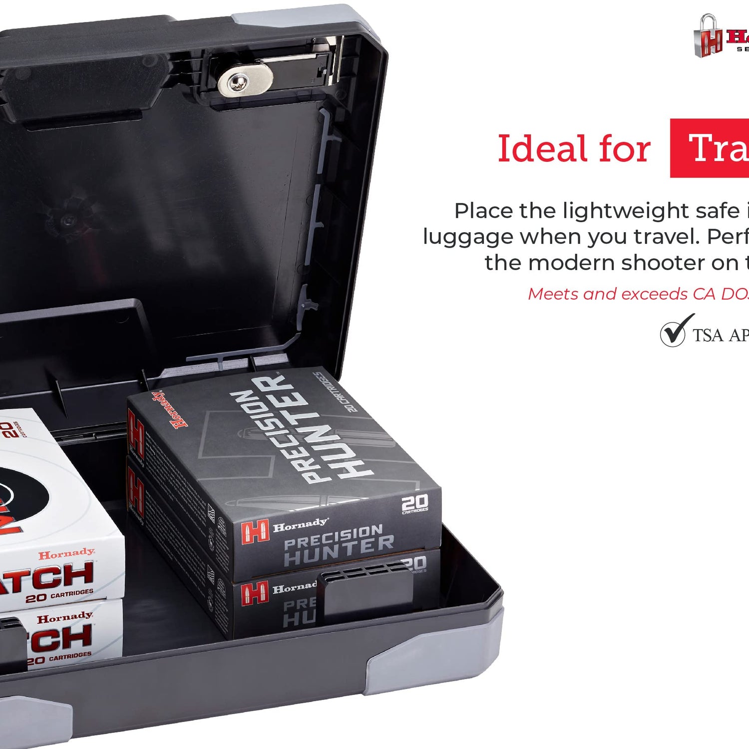 - Hornady TrekLite Lock Box XXL – This lightweight and portable gun safe easily fits in your suitcase, drawer, or under a car seat to provide secure storage for handguns and other valuables