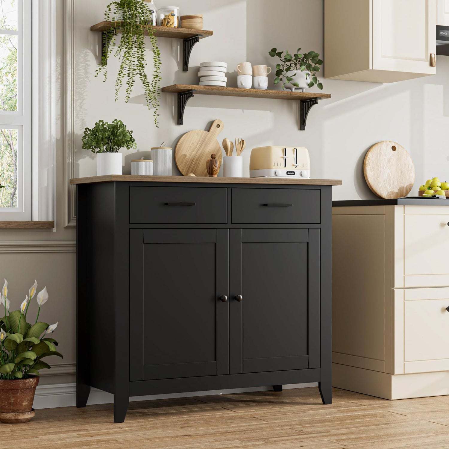 - Belong To Your kitchen: The kitchen cabinet features 2 large door cabinets and 2 full extension drawers great for storing coffee beans, seasoner, spare kitchen paper, or some sundries. Meanwhile, your coffee maker, toaster, can sit on our wide tabletop