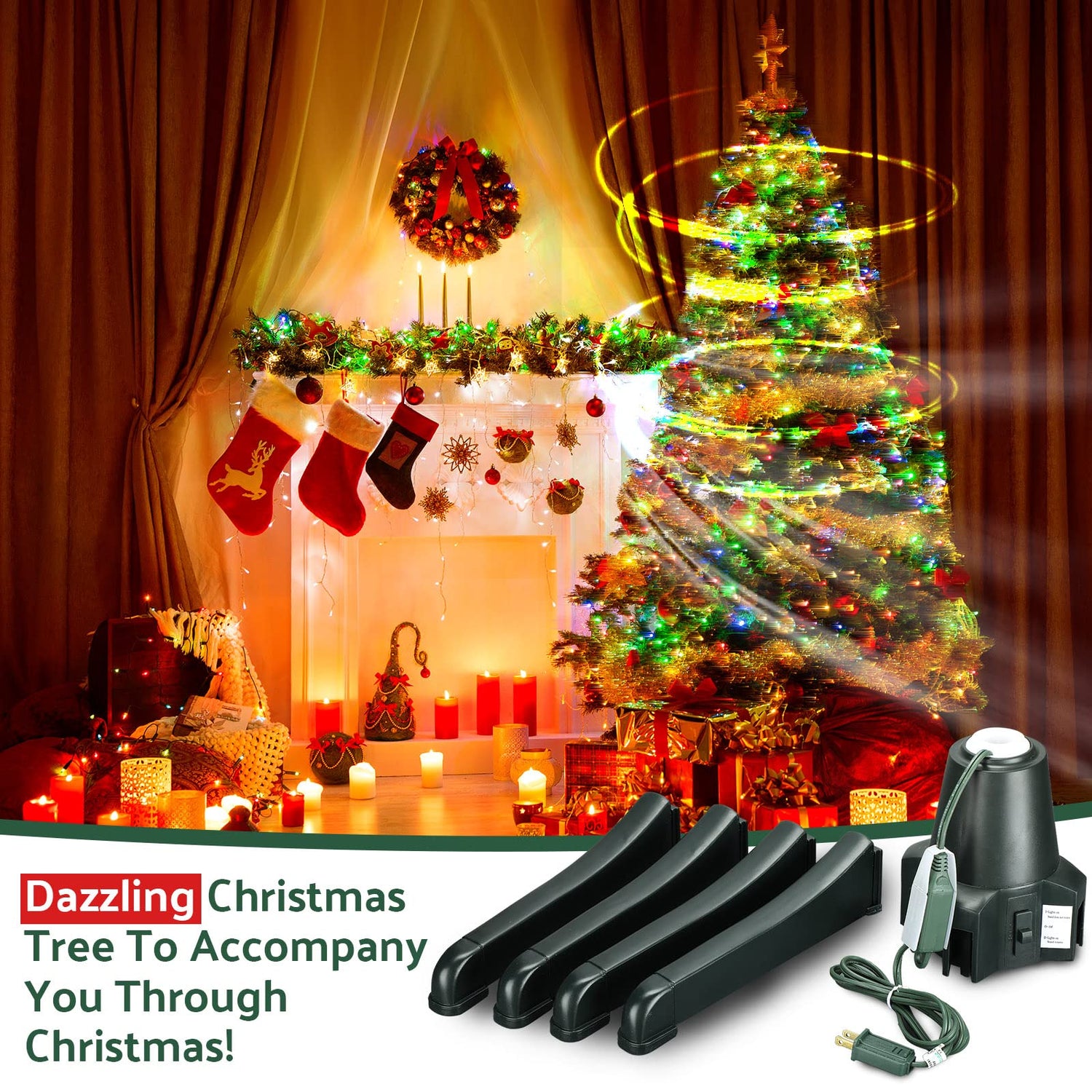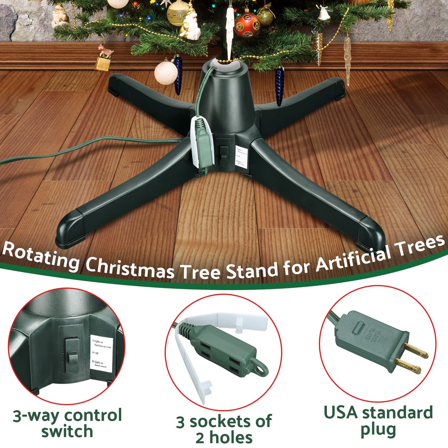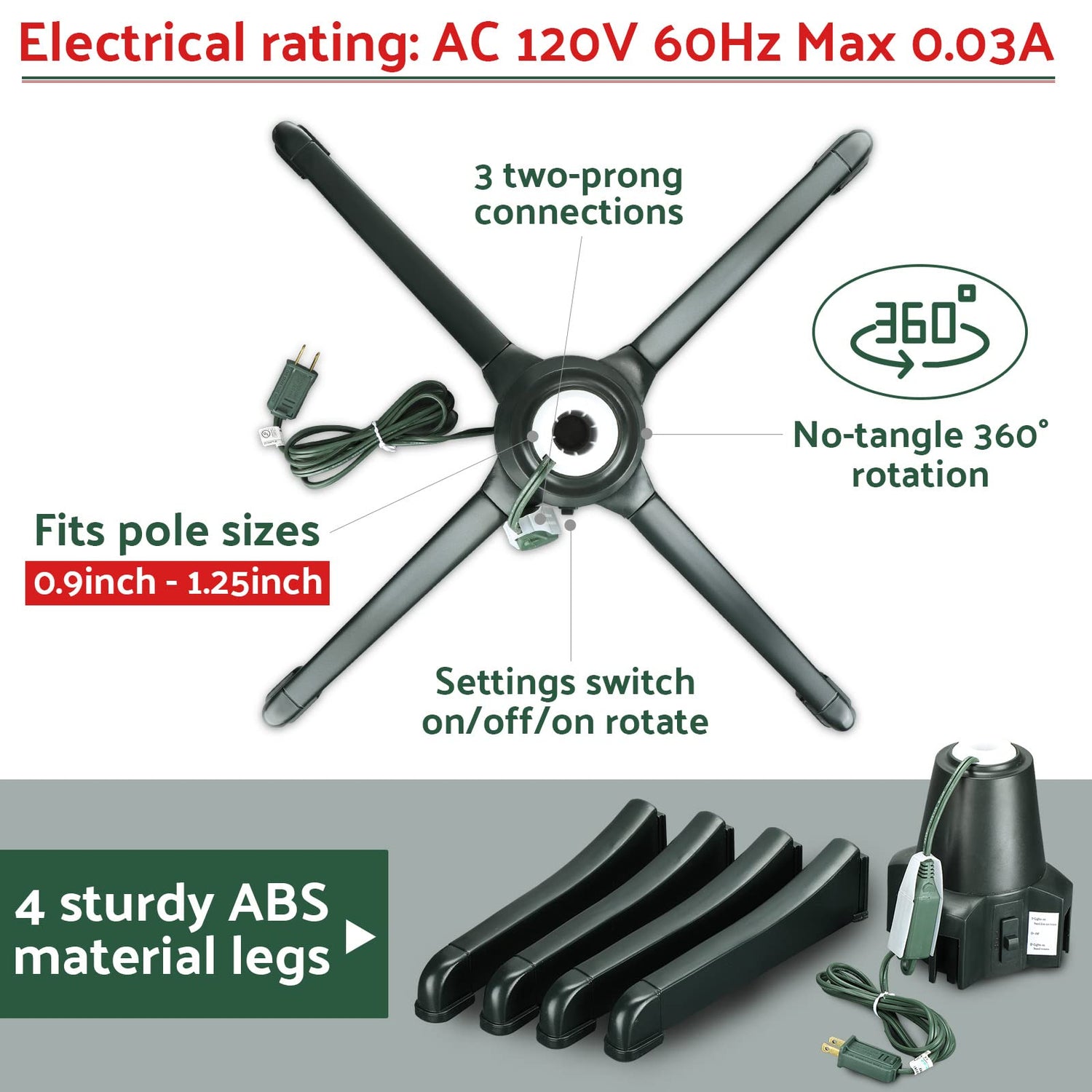 - Package Includes: you will receive 1 piece of rotating stand with 5 separate components, including the motor base and 4 legs, install the tree into the hole of the base and install the legs, connect the power supply, and you can control separately by the 3 way switch