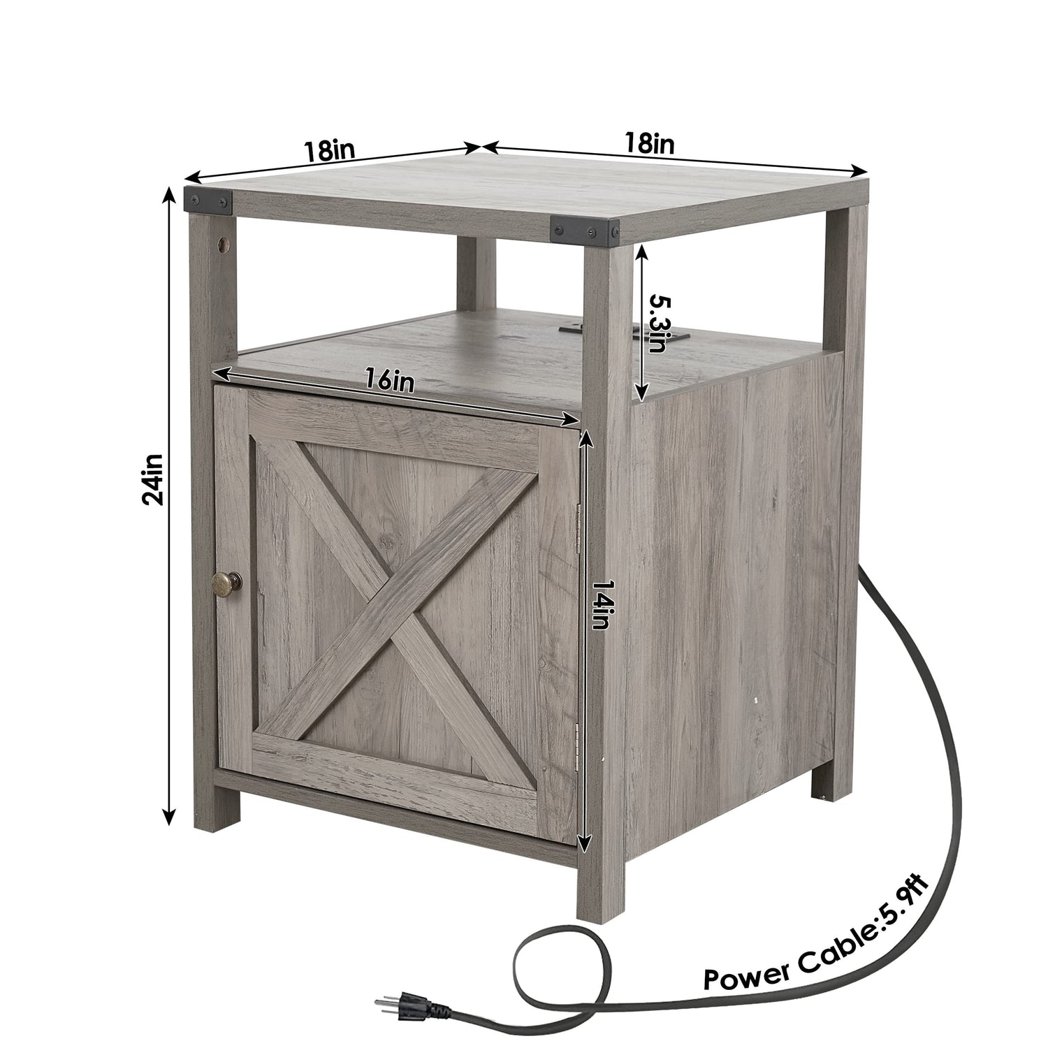 HOSEOKA Farmhouse Nightstand with Charging Station, Rustic End Table Bedroom with Storage Living Room Side Table Grey Night Stand Industrial Bedside Bed Table with USB Ports and Outlets