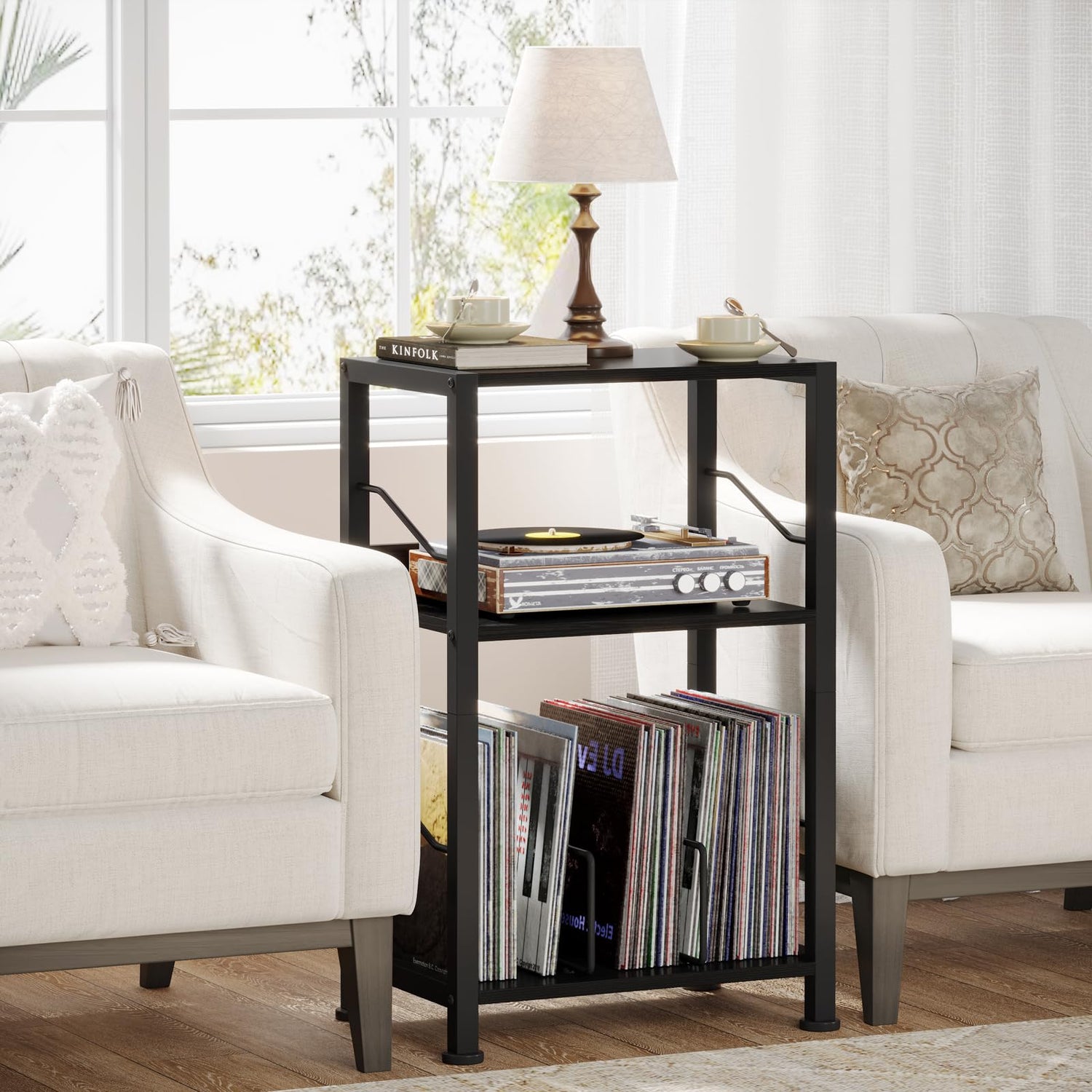 Hosfais 3-Tier Record Player Stand - Retro Vinyl Record Storage End Table Records for Living Room Bedroom (Black)