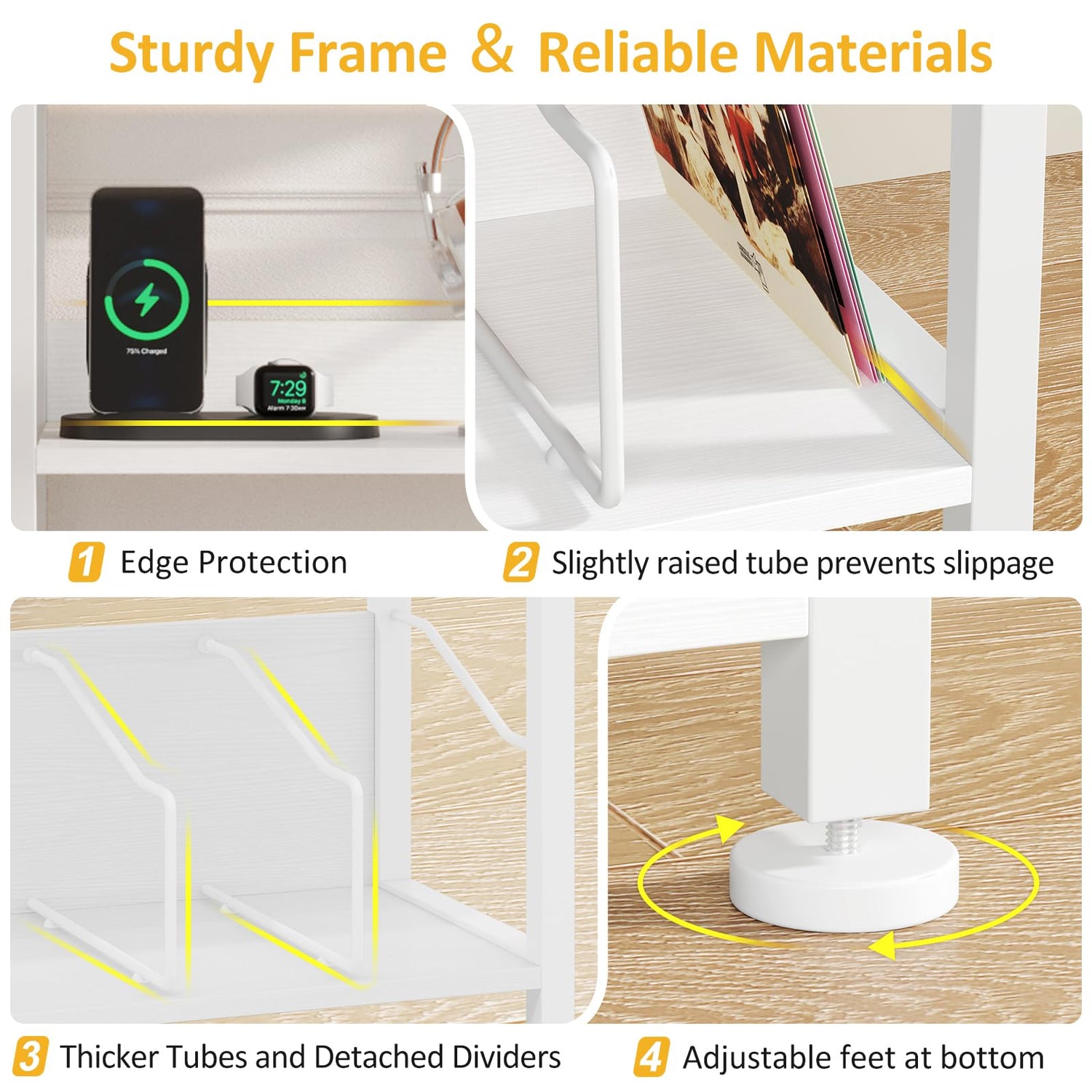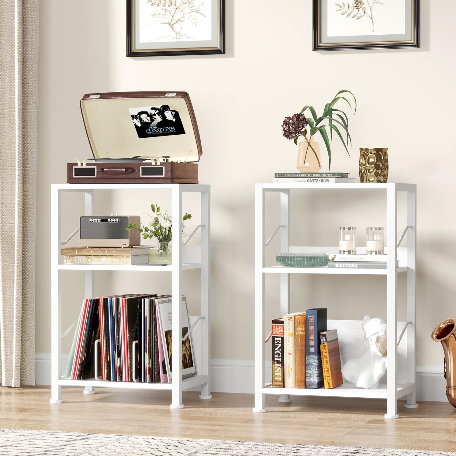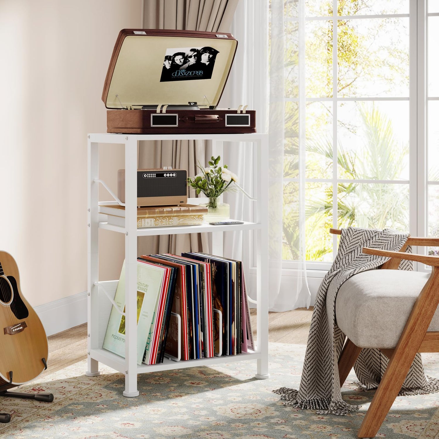 Hosfais 3 Tier Record Player Stand, Retro Vinyl Record Storage End Table Records Shelf for Living Room Bedroom (White)