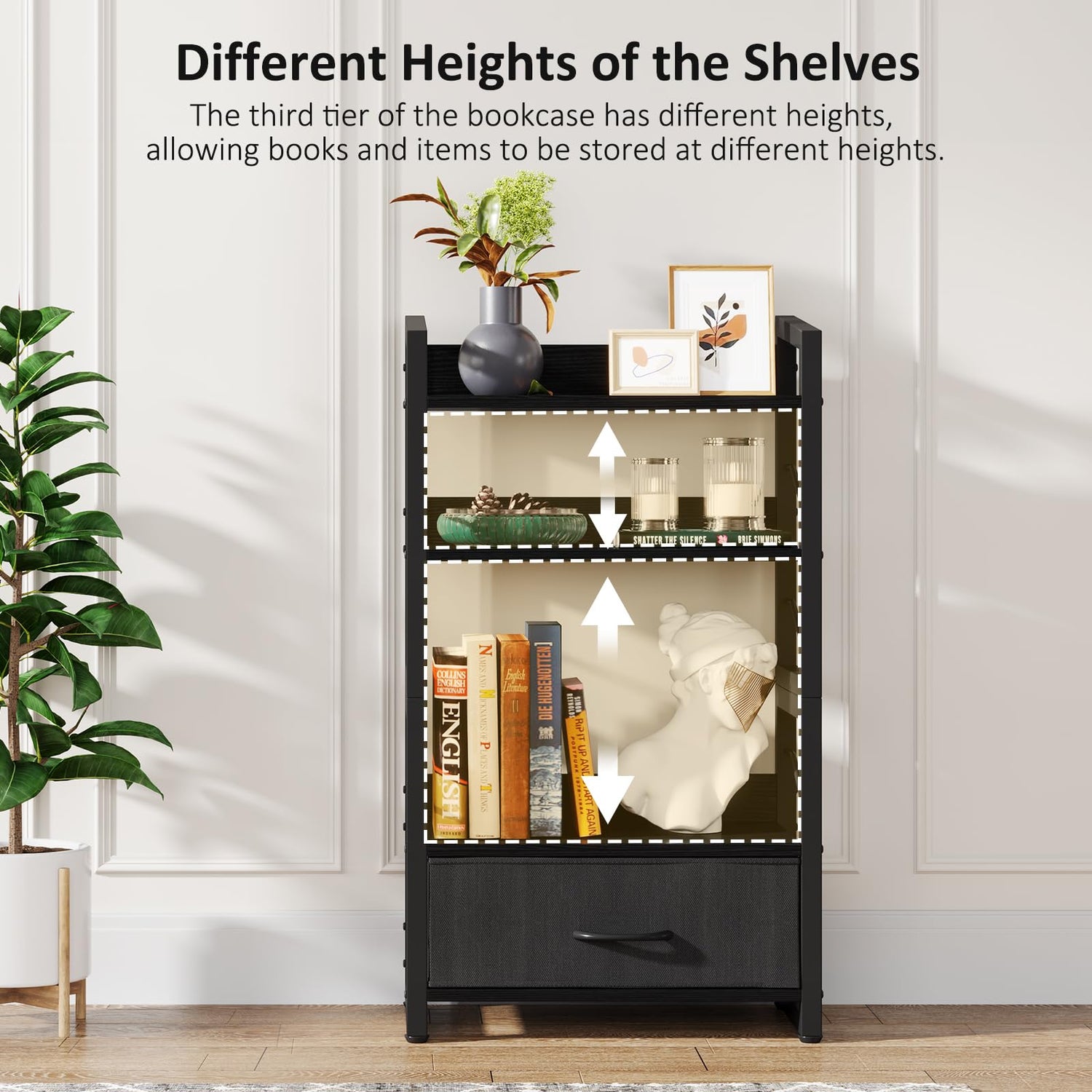 - Small Bookshelf with Drawer: Hosfais upgraded 4-tier bookcase comes equipped with a convenient foldable fabric drawer; Use it to organize your smaller items or to keep your belongings clean and tidy; Plus, you can easily remove it for cleaning or storing
