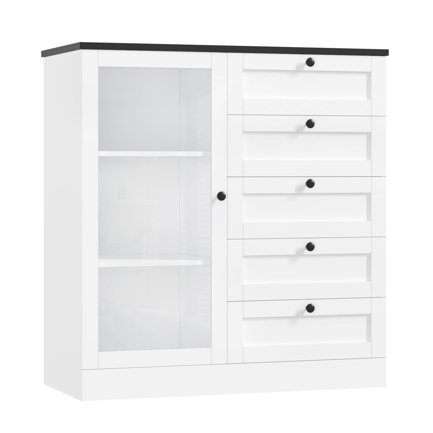 - 【5-Drawer Dresser with Glass Door】Boasting 5 equal-sized pull-out drawers as well as a 2-shelves cabinet with glass door, this white dresser offers ample space to store towels, beauty, skin care, magazines and books, etc. And its spacious tabletop works perfectly to display photos, bouquets, lamps and more
