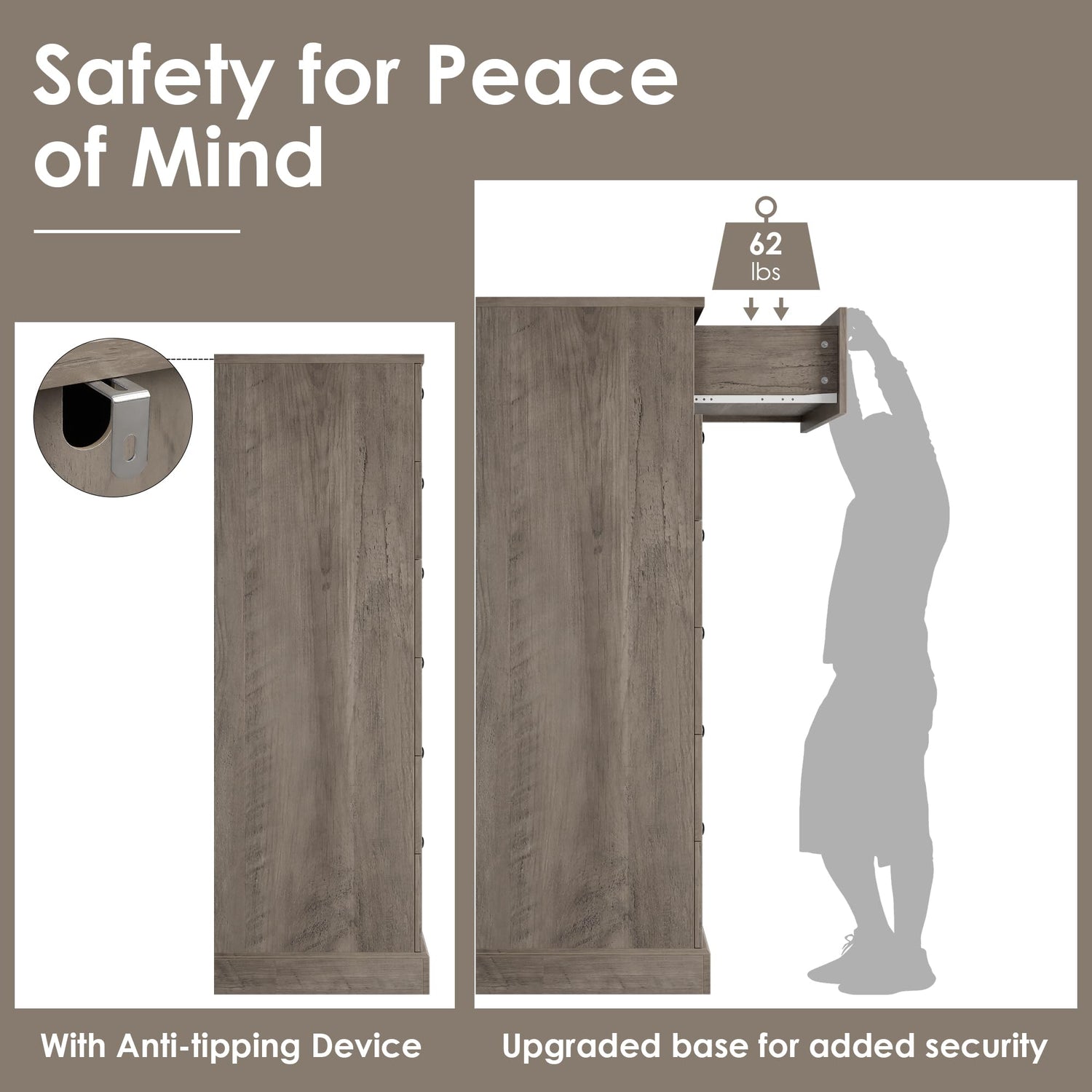 - 【Built To Last】Crafted from high-quality engineered wood and smooth-gliding rails, this wood dresser is specifically designed for long-lasting use. The upgraded base provides top security and each drawer supports up to 22 lbs, top surface holds up to 275 lbs