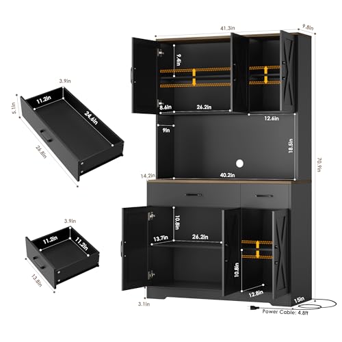 HOSTACK 71" Pantry Cabinet with Charging Station, Tall Kitchen Pantry Storage Cabinet with Microwave Stand, Farmhouse Kitchen Hutch Cabinet with Storage Drawers for Living Room, Dining Room, Black