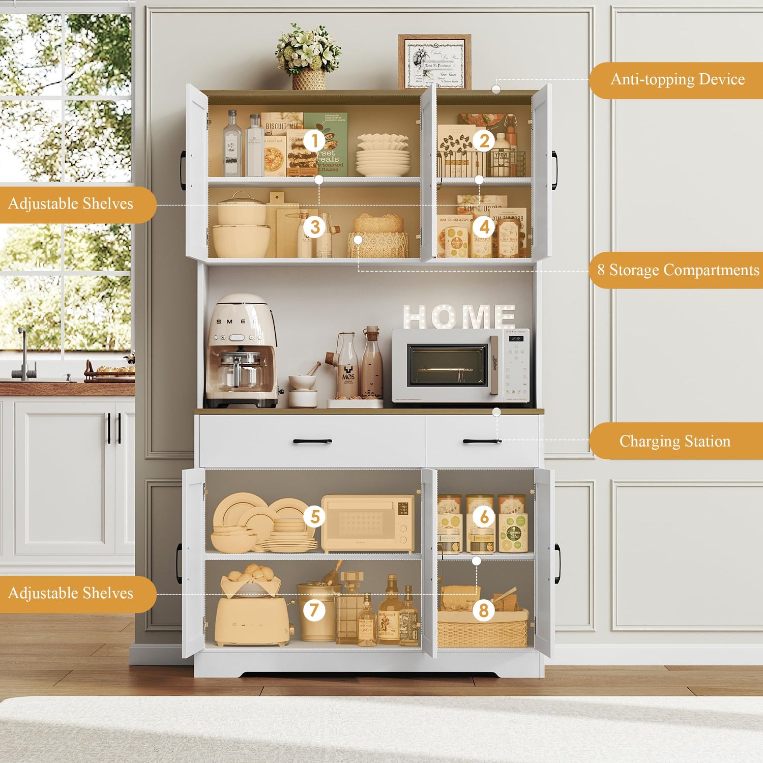 HOSTACK 71" Pantry Cabinet with Charging Station, Tall Kitchen Pantry Storage Cabinet with Microwave Stand, Farmhouse Kitchen Hutch Cabinet with Storage Drawers for Living Room, Dining Room, White