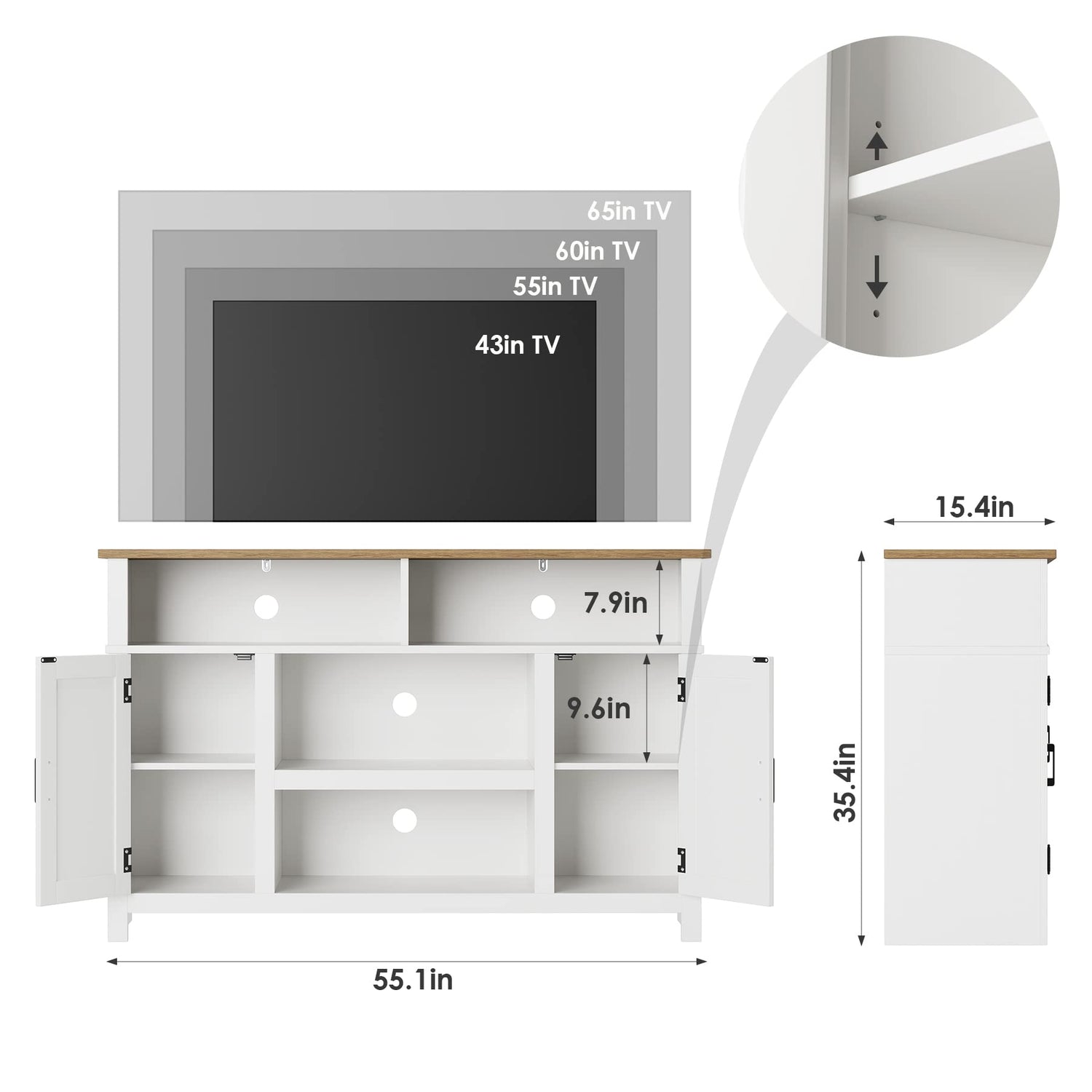 - STABLE STRUCTURE: Made from a combination of high-quality timbers, including solid oak, MDF, pine wood, this farmhouse media console table features superior stability as well as long-lasting durability. With an extra supporting from the middle leg, it holds up to 250 lbs. Overall size: 15.4"D x 55.1"W x 35.4"H