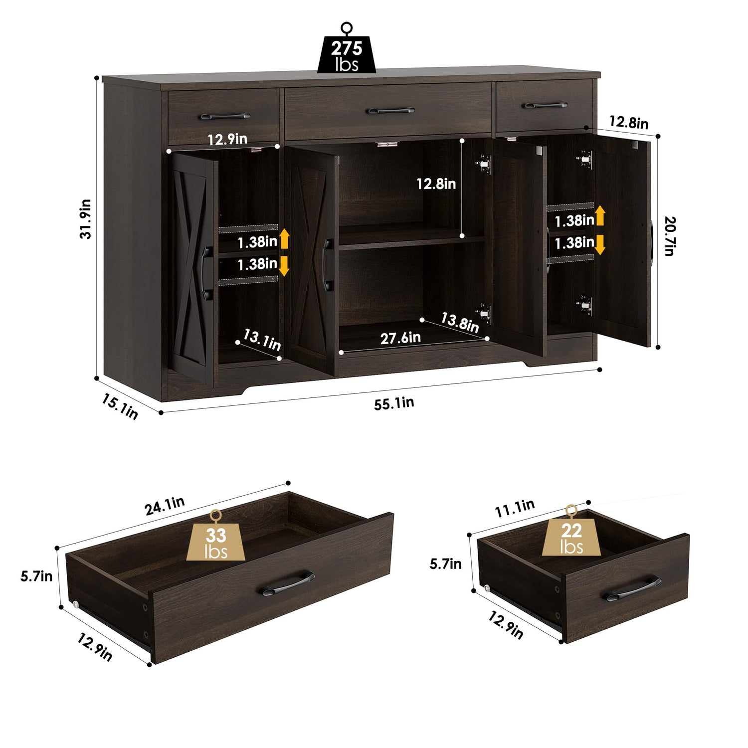 - ใ๐๐ซ๐๐๐ญ๐๐ ๐๐จ ๐๐๐ฌ๐ญใMade of high-quality manufactured wood and smooth-gliding rails in exquisite workmanship, this kitchen buffet with drawers boasts reliable stability and durability to withstand everyday use. Overall size: 15.1"D x 55"W x 31.9"H. Weight Capacity: 300 lbs