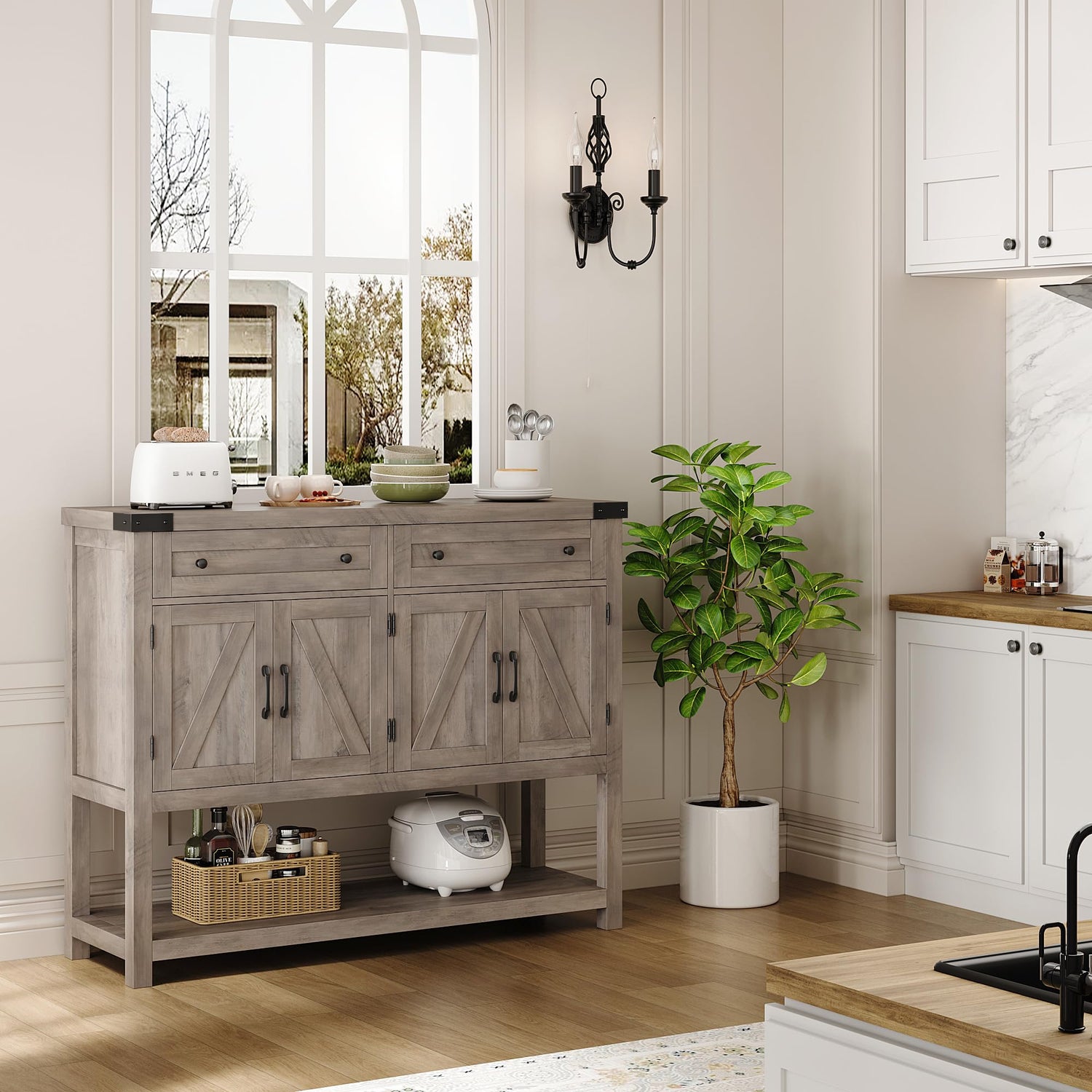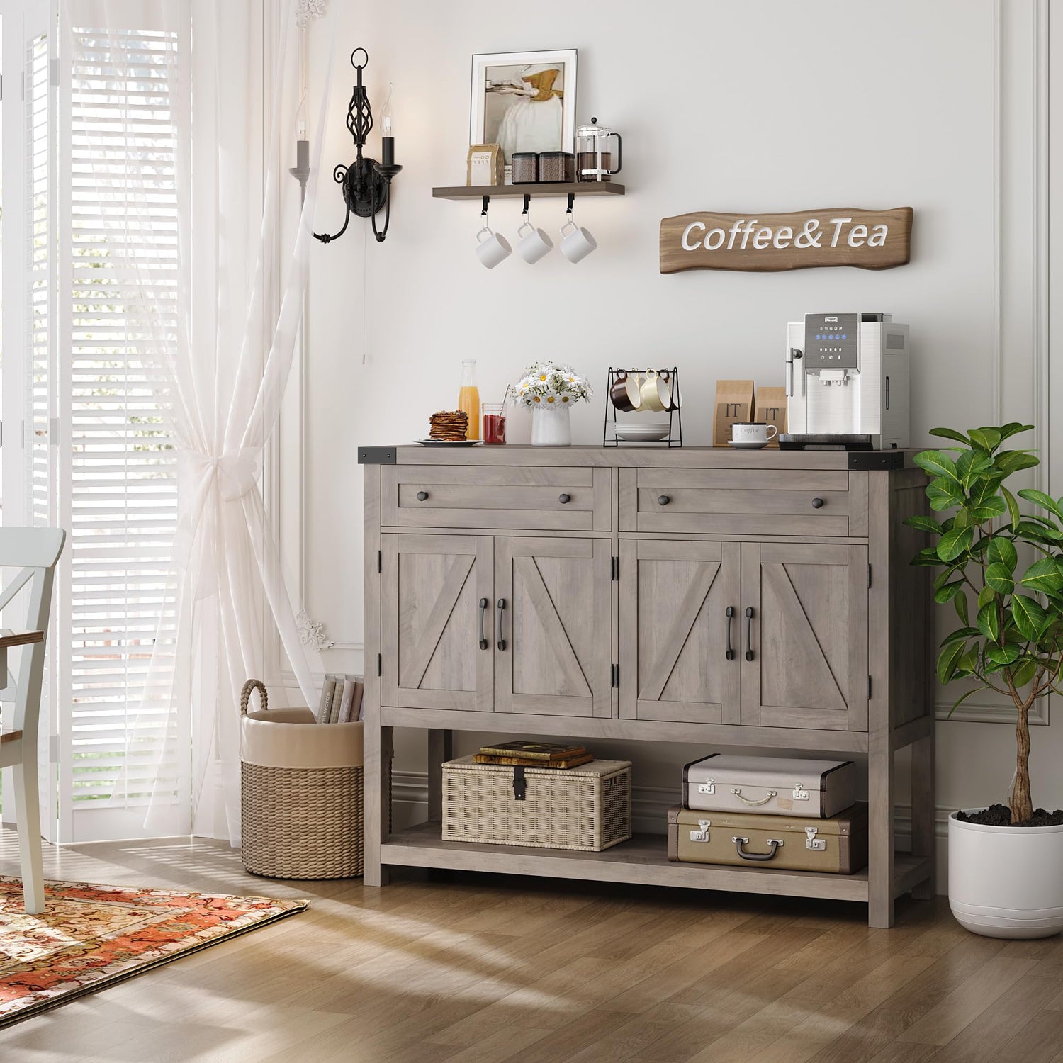HOSTACK Buffet Sideboard Cabinet with Storage, 47.2" Modern Farmhouse Coffee Bar with 2 Drawers, Barn Doors Console Table with Shelf for Kitchen, Dining Room, Living Room, Entryway (Ash Grey)