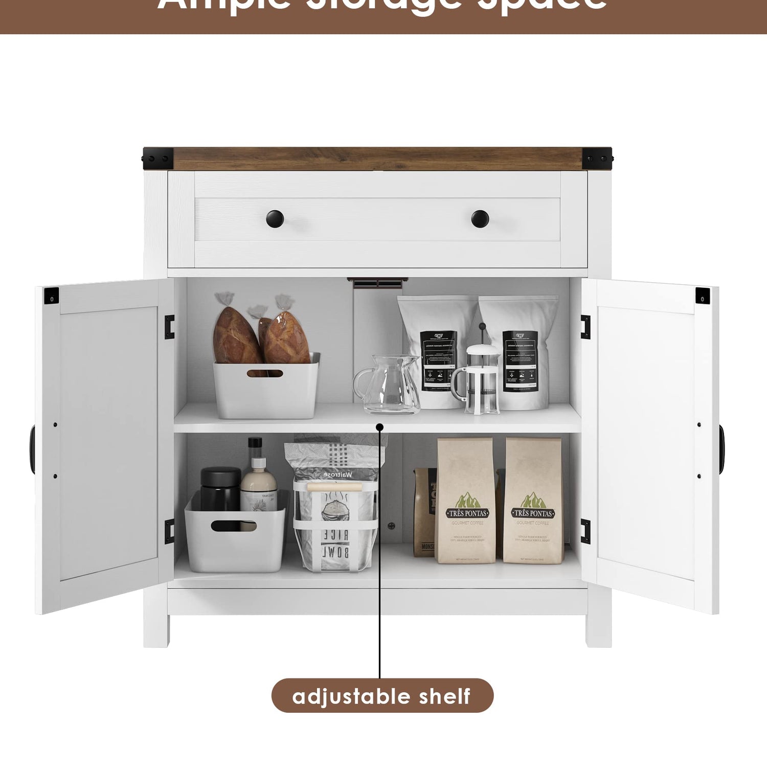 - [Ample Storage Space]: The kitchen storage cabinet features a large drawer and 2 doors cabinet with an adjustable shelf to meet your storage needs for coffee beans, seasoned, and some sundries, while the wide tabletop creates an accessible way to display microwave, toaster, and coffee makers