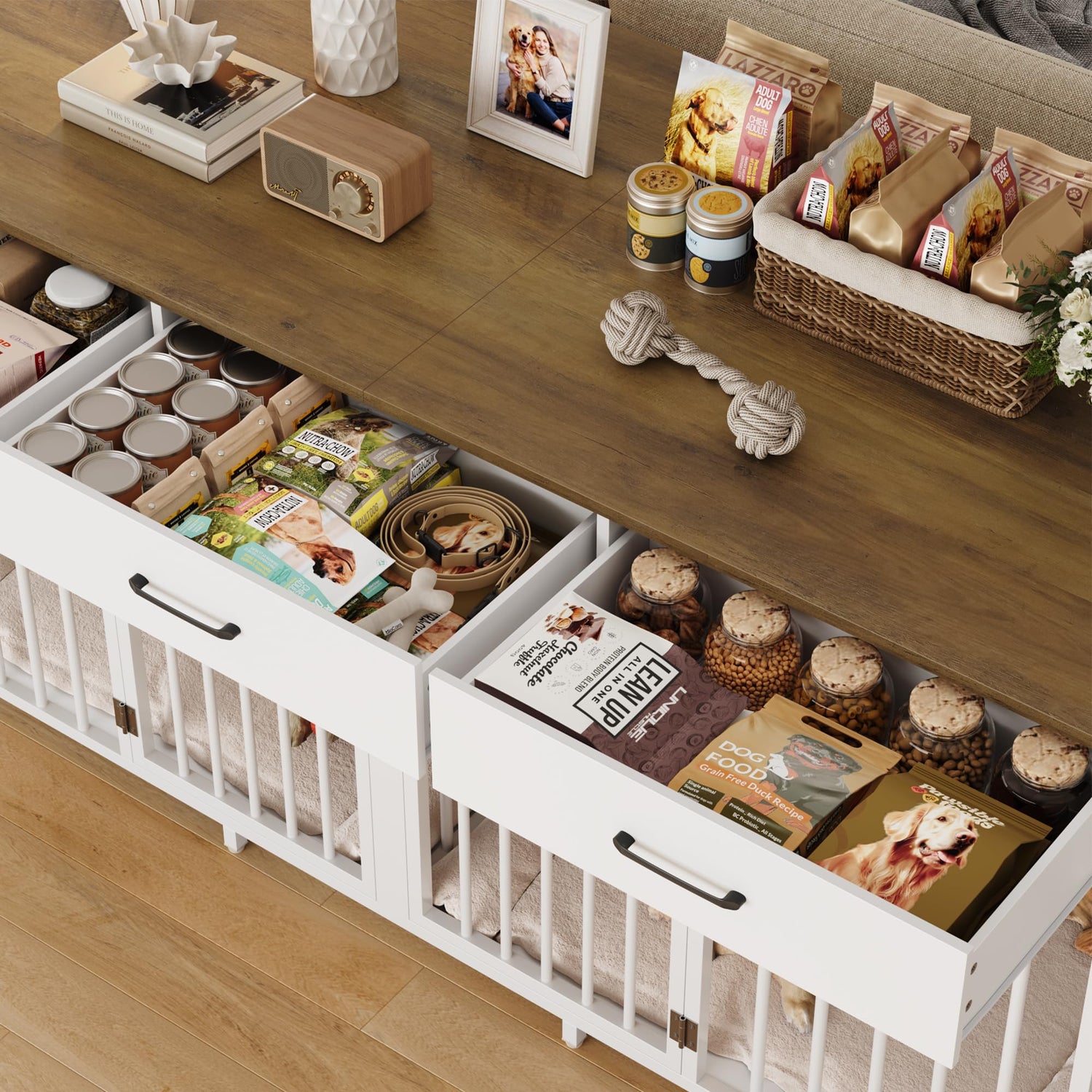 - Furniture-Style Dog Crates: This dog kennel features a large tabletop and 3 equal-sized drawers which can effortlessly keep your dog things like treats and toys organized, while the bottom cage is designed with interior size of 70"L x 20"W x 25"H, providing ample space for dogs to stretch and rest comfortably