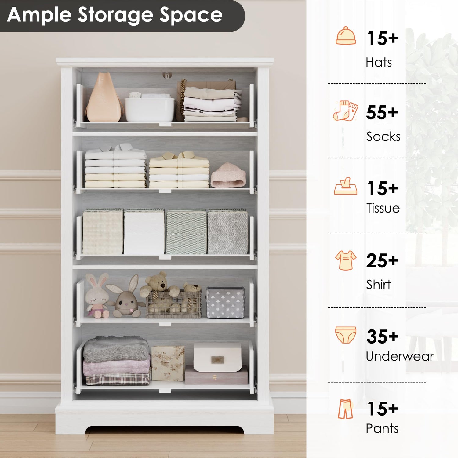 - Multi-functional Dresser: This white dresser is a perfect accent for any space. Whether you need a drawer dresser to store books in the guest room, a chest of drawers to keep your daily necessities within reach in the hallway, or even a slim-profiled dresser to fit into a nook in your living room, this piece of furniture serves all your needs