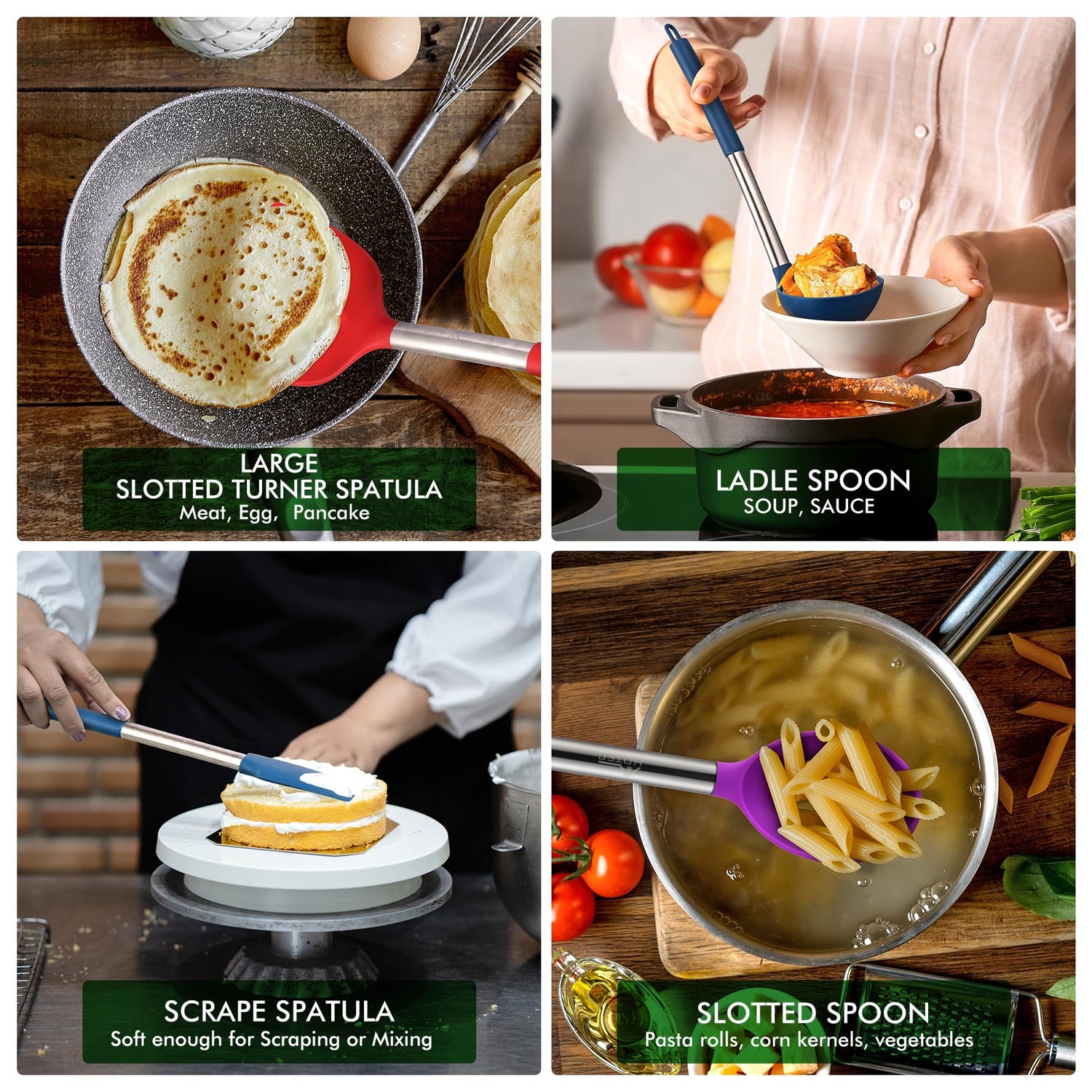 - 【HIGH QULAITY】: Made of food grade silicone with Non-rust Stainless Steel,BPA Free, sturdy. Unlike the nylon or wooden material easy broken, our utensils set will last long.