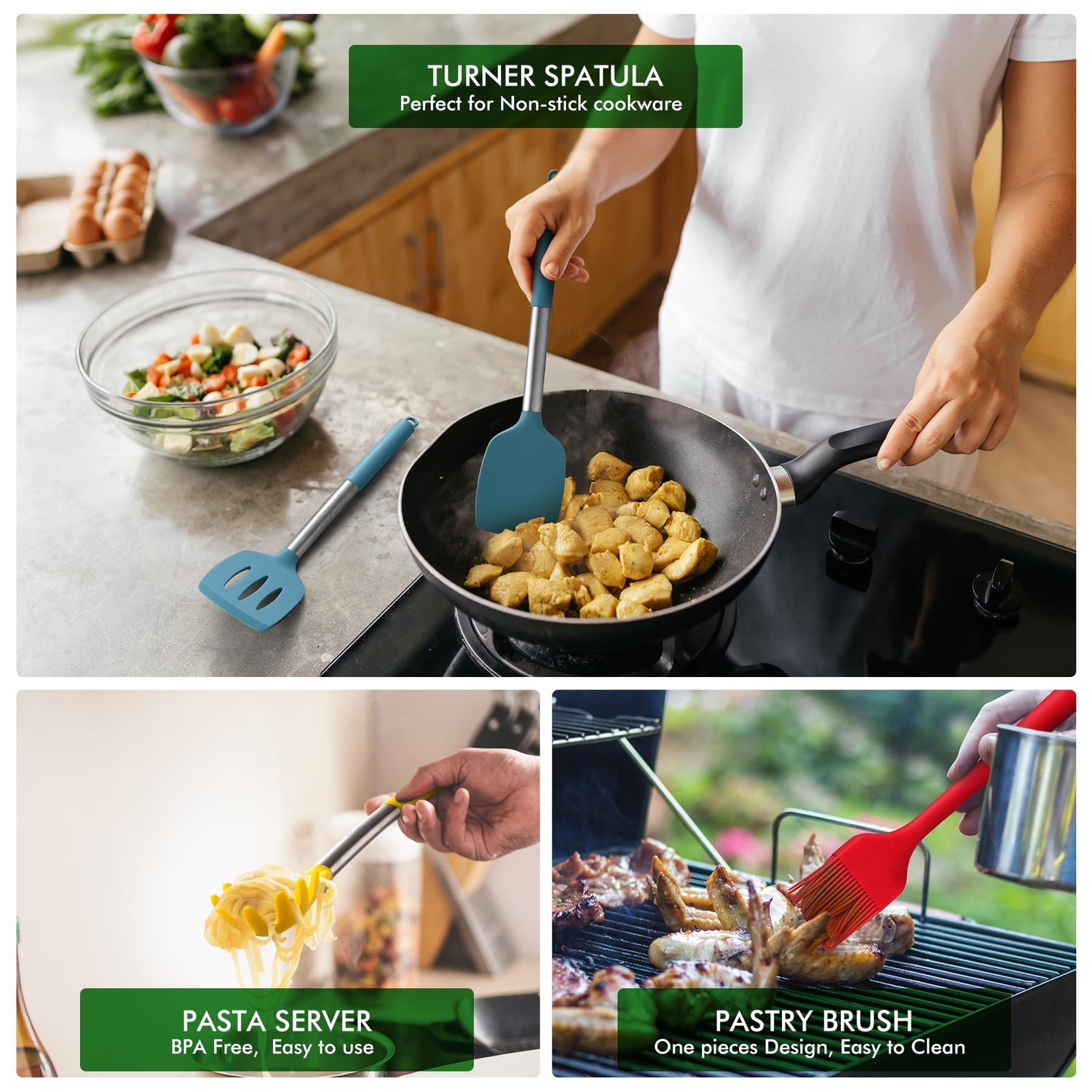 - 【HEAT RESISTANT】: No-metling any more, temperatures up to 446°F, silicone head better protect your nonstick cookware, non-scratch.