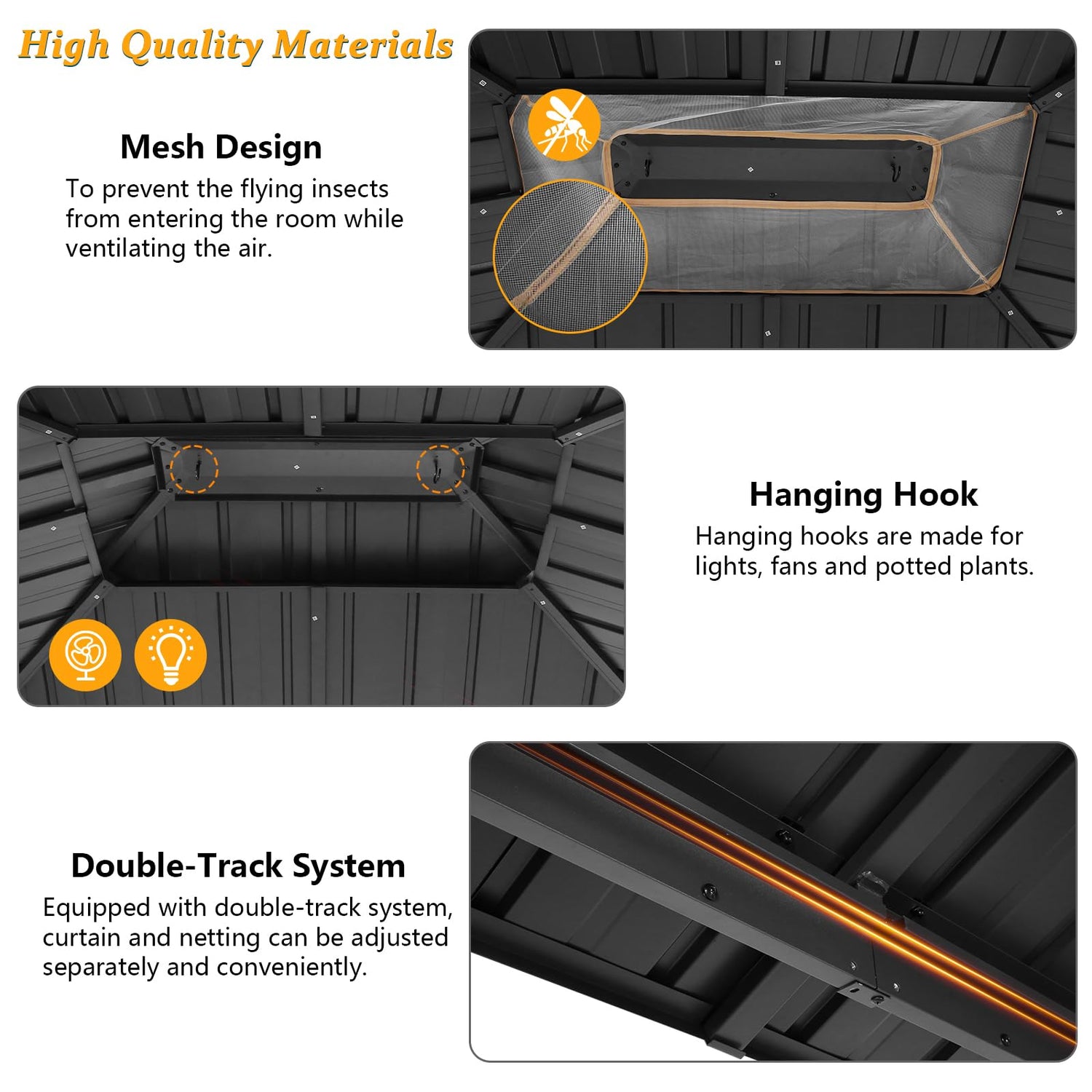 - ✅【Galvanized Steel Double Roof】 Experience superior airflow with our 10x12 hardtop gazebo, designed to keep the air fresh and refreshing. The galvanized steel construction offers remarkable durability and corrosion resistance, ensuring your gazebo stands the test of time. Plus, the double roof provides excellent UV protection, safeguarding you from harmful rays while you relax outdoors.