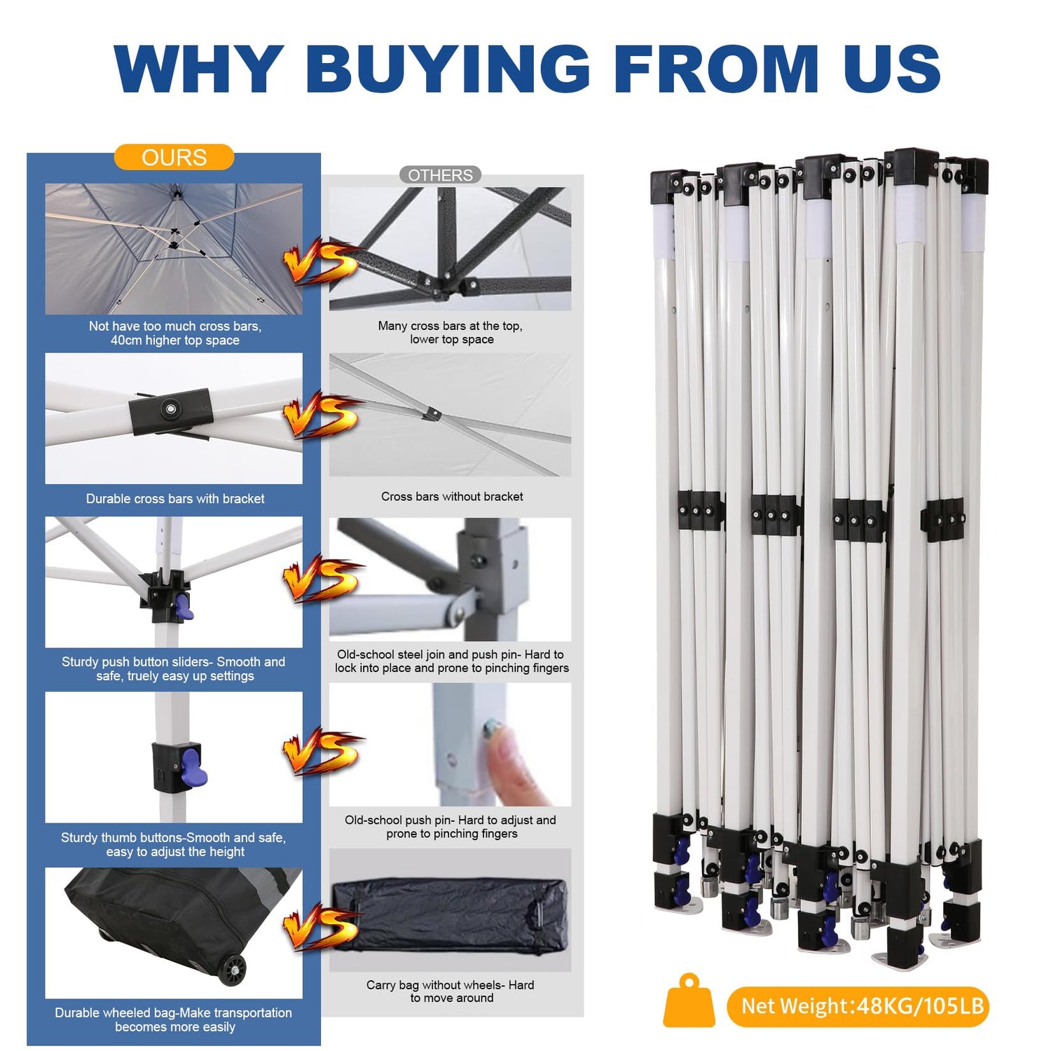 - Upgraded Wheeled Bag: Easy setup canopy with metal structure weighs 82 pounds, so we provide you a rolling bag with 2 large removable wheels which makes it super easy to move around and storage. Ideal for family gatherings, yard sales, craft fairs, outdoor birthday parties, weddings, beach, outdoor events and more.