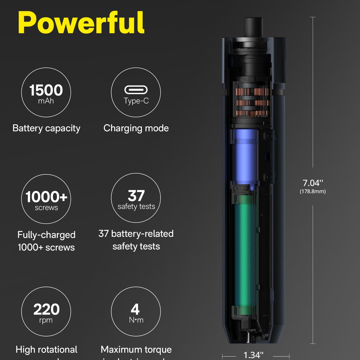 - CHARGE LESS, SCREW MORE! - This power screwdriver packs a punch with its 1500mAh high-capacity battery. After a rigorous 37-step testing process, it offers insane endurance—driving over 1000 screws on a single charge. And when it's time to recharge? Just plug it into a Type-C port, and you're done in under 150 minutes. Super easy, super fast, and efficient!