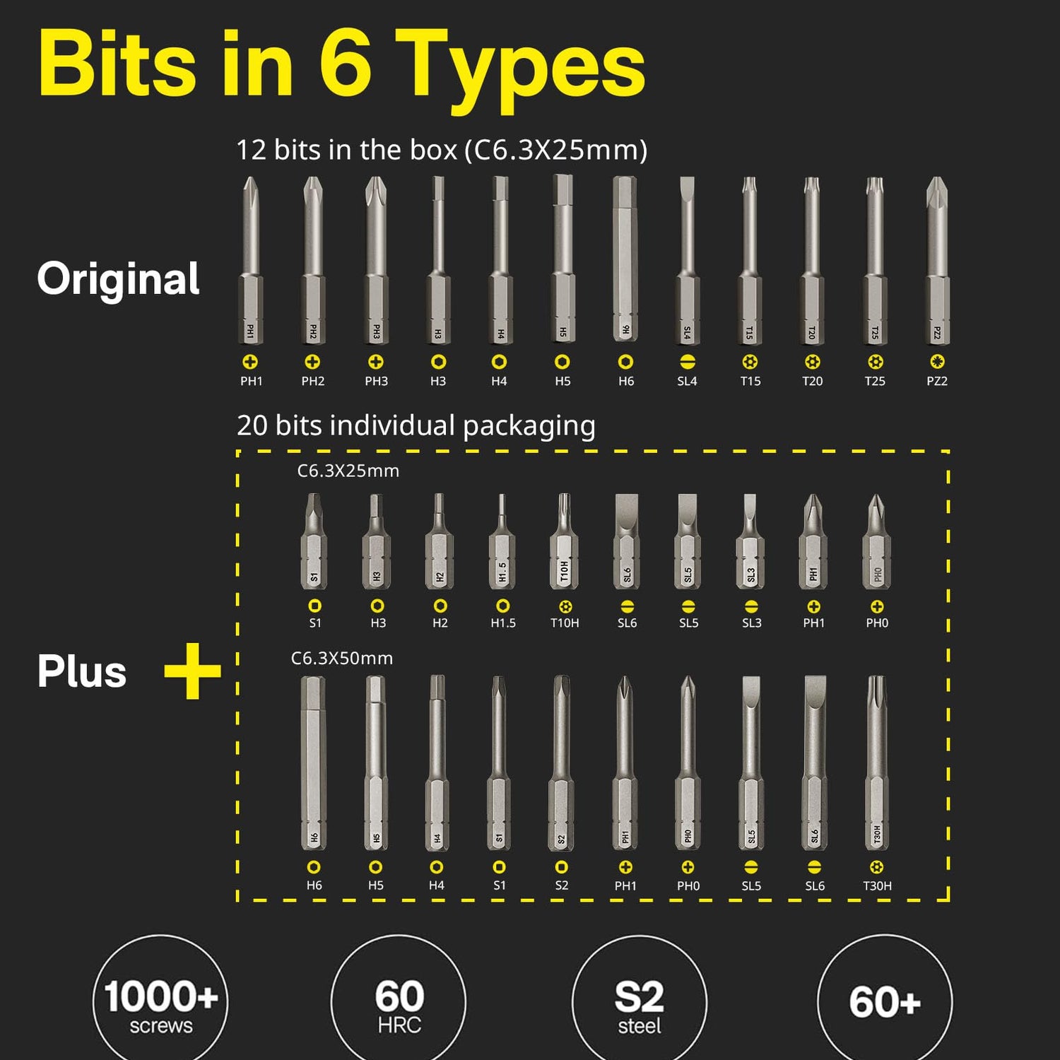 - DIY DREAM KIT IN A BOX! - Unlock your DIY potential with this all-inclusive kit: 1 x Cordless Screwdriver, 2 x Set of 32 Bits (12 in the Storage Box, 20 Extra), 1 x Aluminum Storage Box, 1 x USB Type-C Charging Cable, 1 x User Manual. Bit Assortment: Philips: PH0, PH1, PH2, PH3, Hex: H1.5, H2, H3, H4, H5, H6, Torx: T10, T15, T20, T25, T30, Flat Blade: SL3, SL4, SL5, SL6, Pozidriv: PZ2, Square: S1, S2.