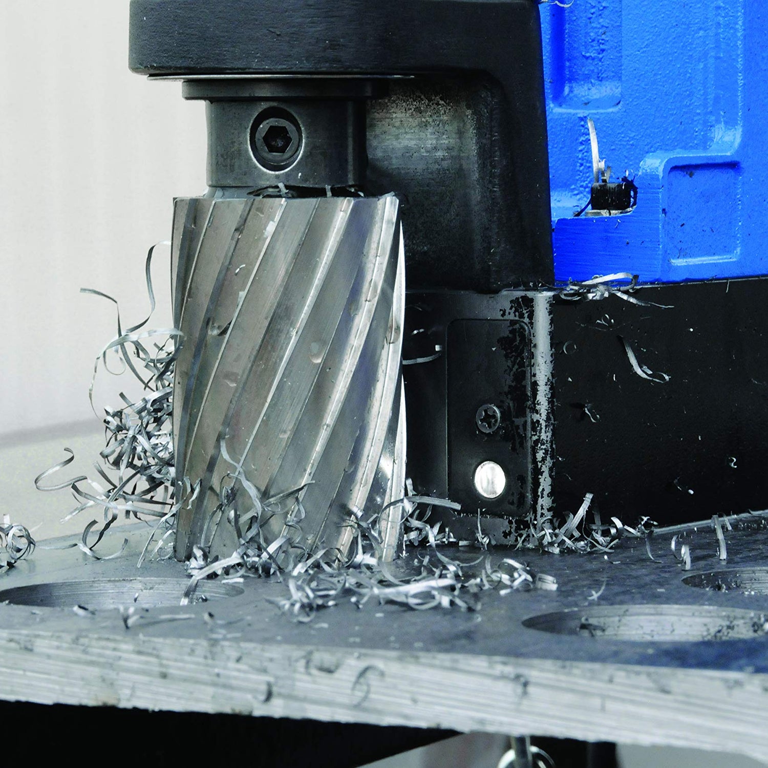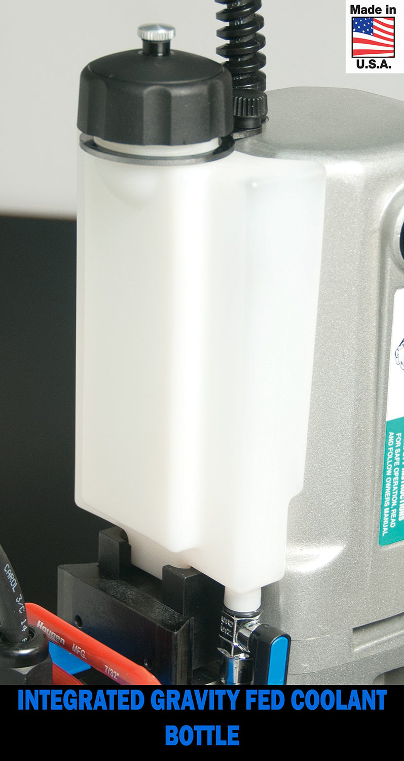 The addition of a two stage magnet increases magnetic holding power by 30% when the drill motor is turned on. This saves energy and increases magnet life. A new arbor system utilizes a 5/8" slot drive for more rigidity, hole accuracy and quicker use of accessories such as drill chucks and tapping attachments.