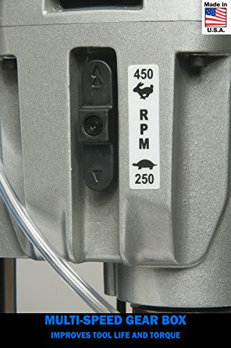 - A powerful two speed mag drill with great power to weight ratio. Large 2" x 2" capacity, Powerful high torque Hougen motor and gears, Two Speed gearbox - 250 & 450 RPM.
