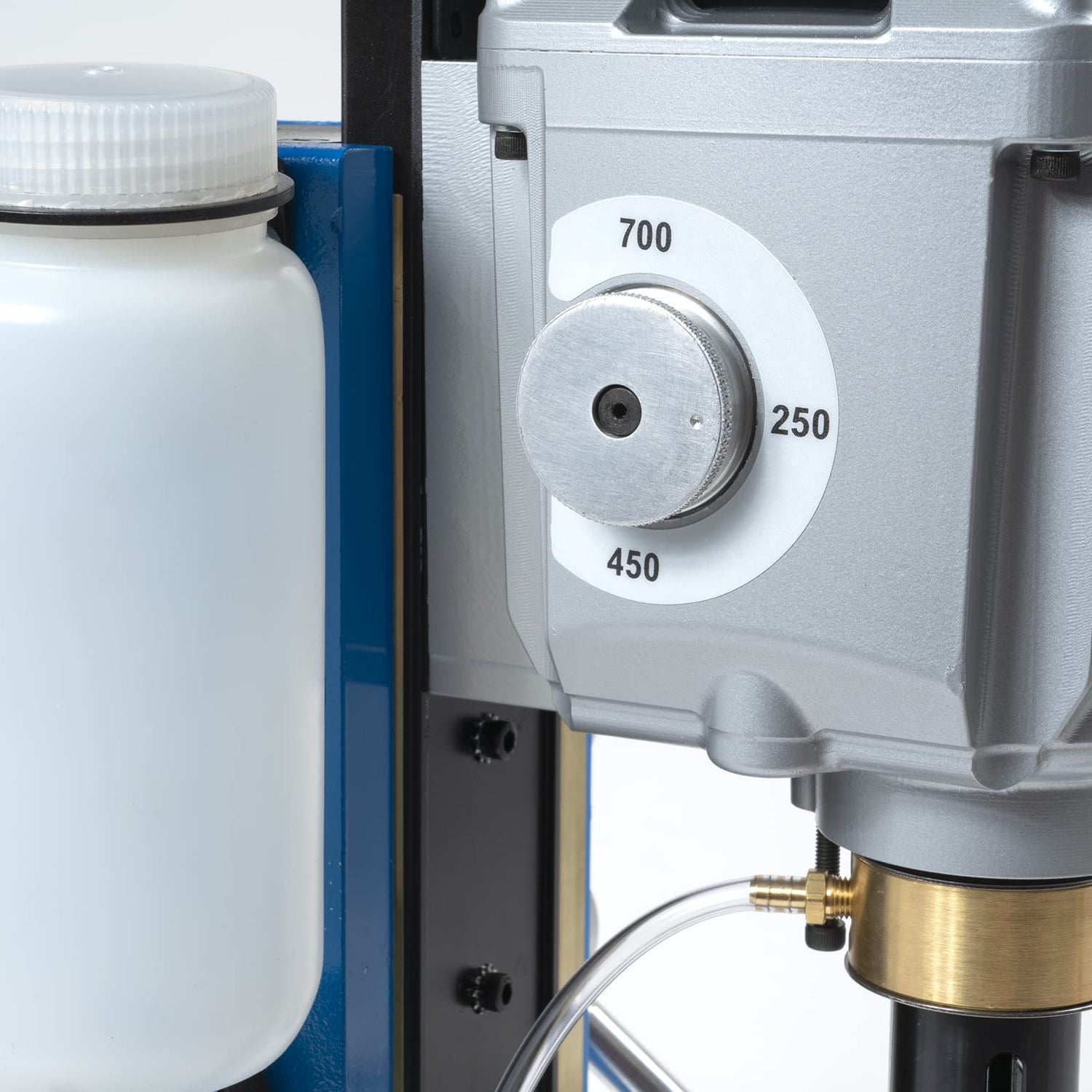 - Three speed gear box - 250 / 450 / 700 RPM. 115V, 50/60 Hz - 13.5A, 1553W, Pilot light for low light conditions and greater hole accuracy.