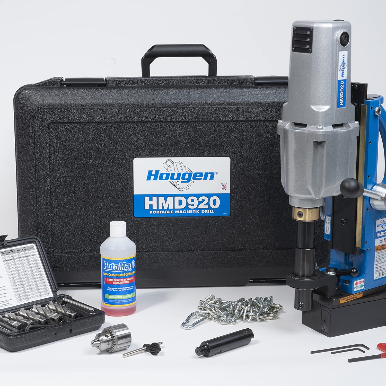 - Hougen HMD920S 115-Volt Swivel Base Magnetic Drill Fabricator's Kit Includes: HMD920 Swivel Base Coolant, 1/2" Drill Chuck, Adapter, & "12,000-Series" Cutter Kit ((2) Pilots, (2) Wrenches and (5) Cutters (9/16, 11/16, 13/16, 15/16 & 1-1/16")) and Carrying Case, Pint of Coolant, Safety Chain, & Hex Wrenches.