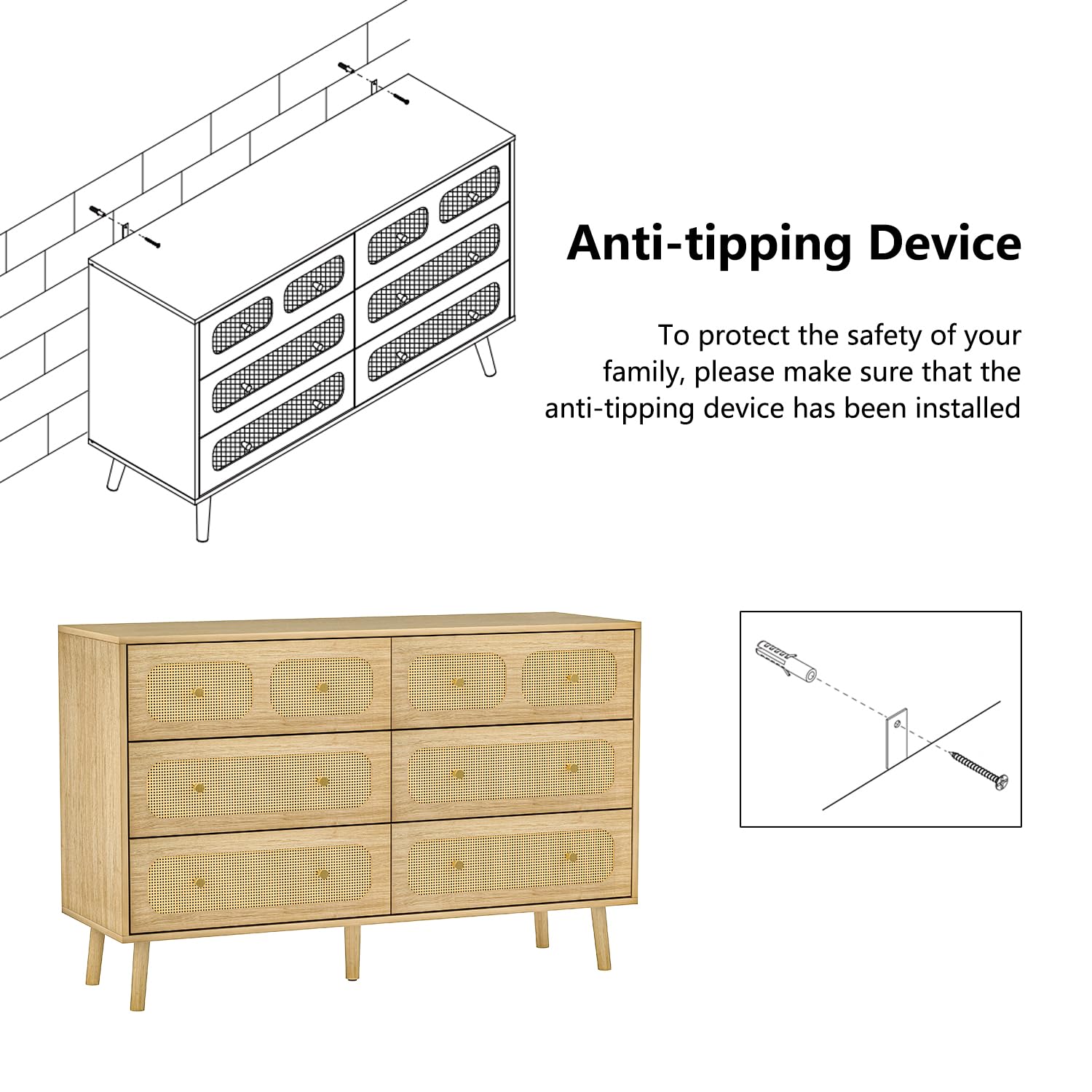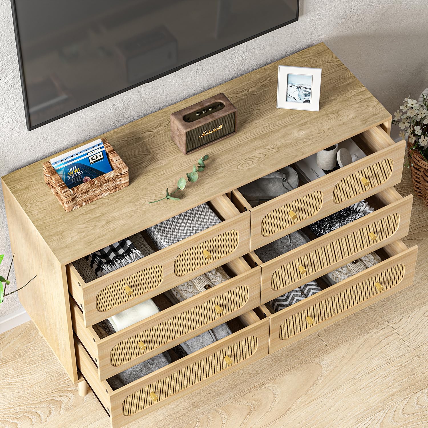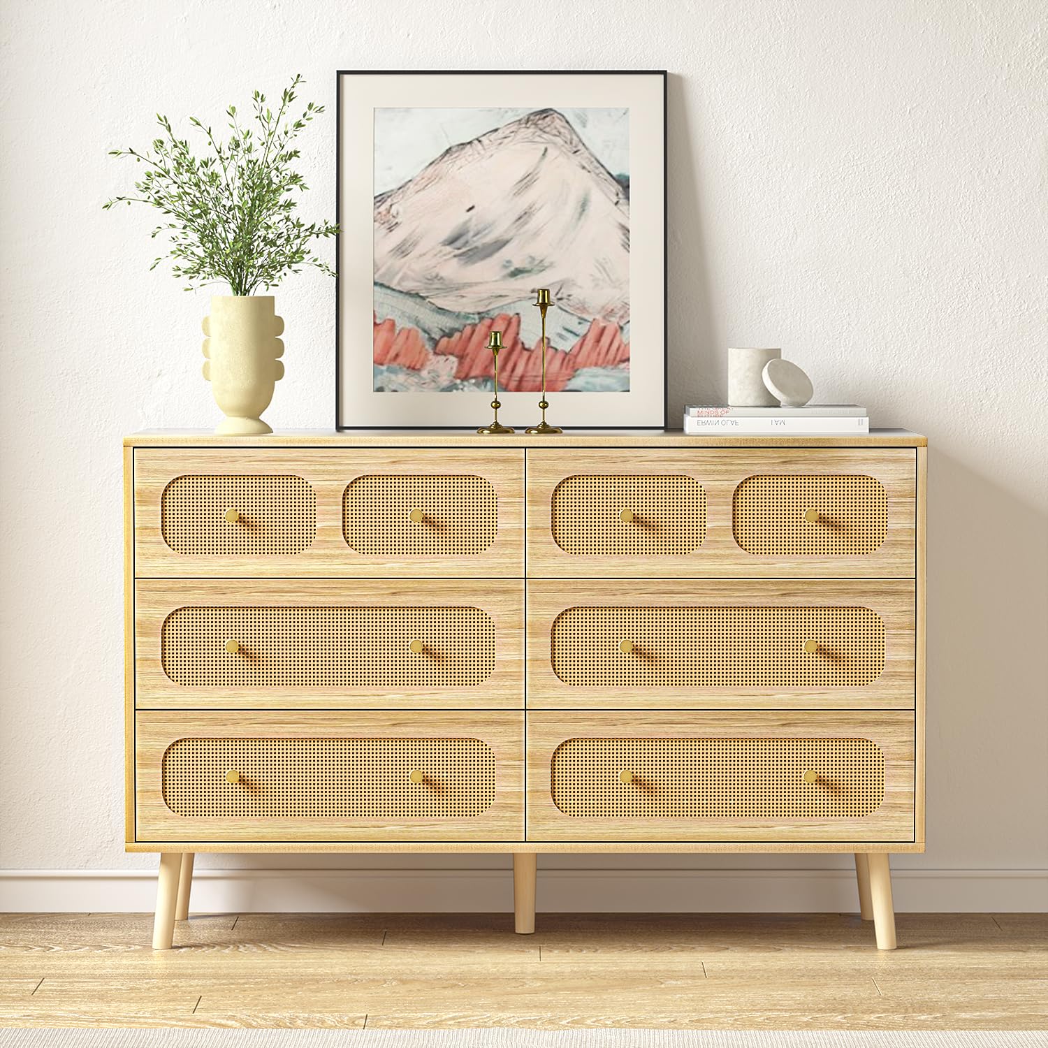 HOUROM Rattan Dresser for Bedroom, Modern 6-Drawer Double Dresser with Gold Handles, Wood Storage Chest of Drawers for Bedroom
