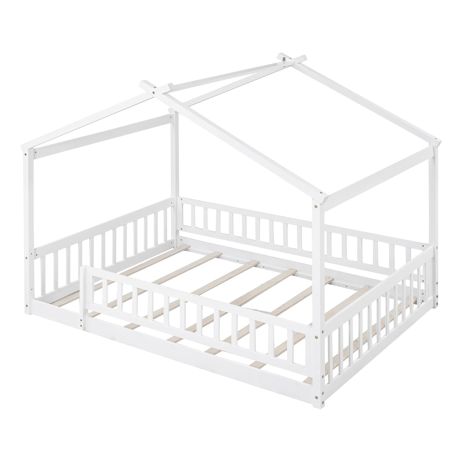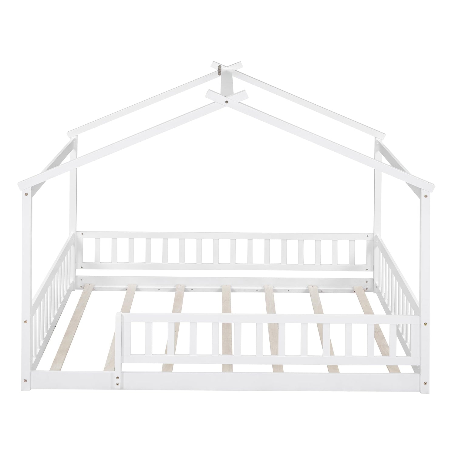 House Bed Full Size Floor Bed with Fence Railings, Wooden Montessori Style Bed Frame for Kids, Fun Playhouse Beds for Girls Boys, White