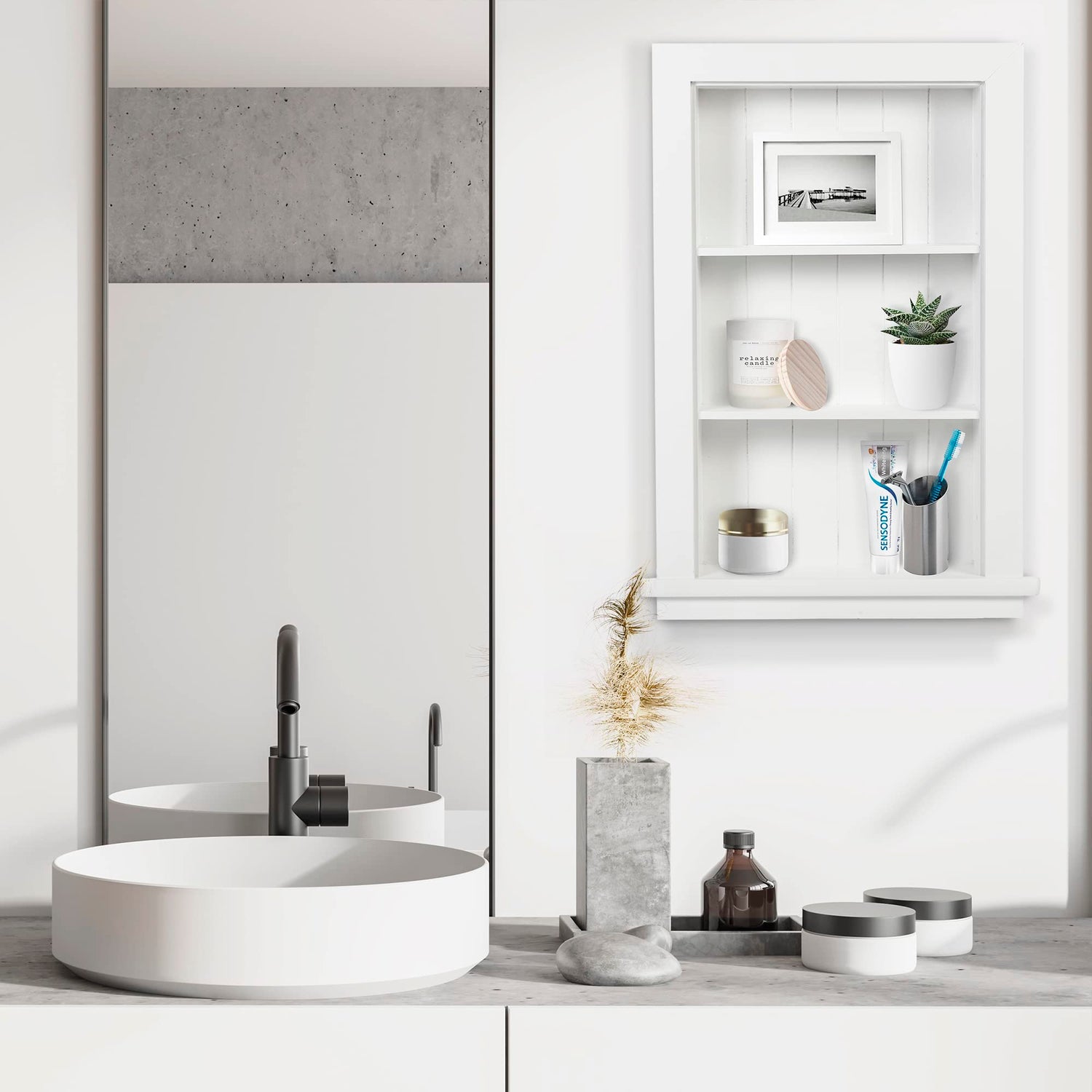 - CREATE MORE STORAGE: A recessed shelf featuring three shelves. It has a white lacquered finish and vertical panels for an elongating look. The medicine cabinet shelves create more space and organize your tchotchkes in style without taking up valuable floor space.