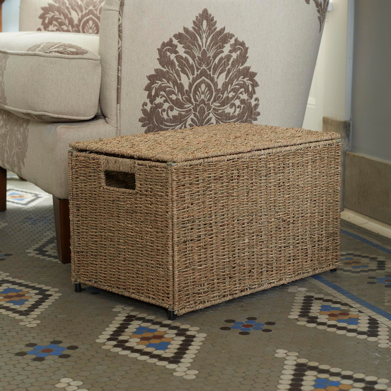 Details: HOUSEHOLD ESSENTIALS Natural Wicker Storage Trunk creates beautiful storage space from handwoven Seagrass. This storage trunk has a robust braided weave that is thick and resilient. The trunk has 2 open handles and a lift-off lid. This wicker storage trunk is ideal as a blanket chest in a bedroom or living room. It’s also a brilliant alternative to plastic storage totes for in-home storage. The small trunk is 11.81 inches high x 19.30 inches wide x 12.20 inches deep. It’s wicker home storage that is part of the style and design of the home. It’s a smarter way to design and organize. Discover the full range and connect your home’s style with beautiful water hyacinth baskets, trunks, and tables.