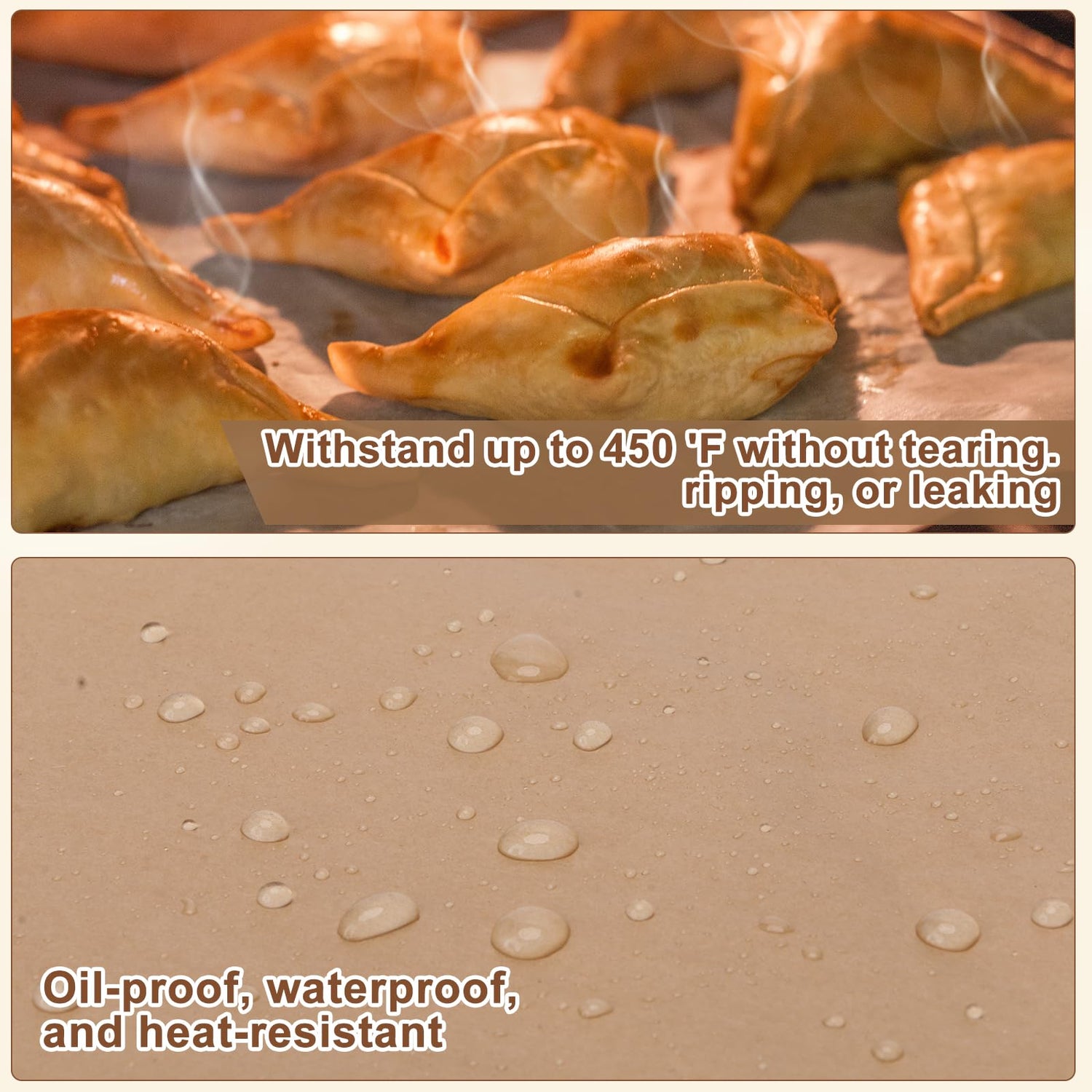 - 【PERFECT FOR BAKING】Greaseproof, waterproof butter paper. Won't tear or soak. Withstands up to 450°F, above most recipe needs. Food slides off, no oil spray required before baking.Our disposable parchment paper liner is a must-have for baking cookies, cakes, macarons, bread, pizza, cupcakes, and even hot sandwiches or gift wrapping.