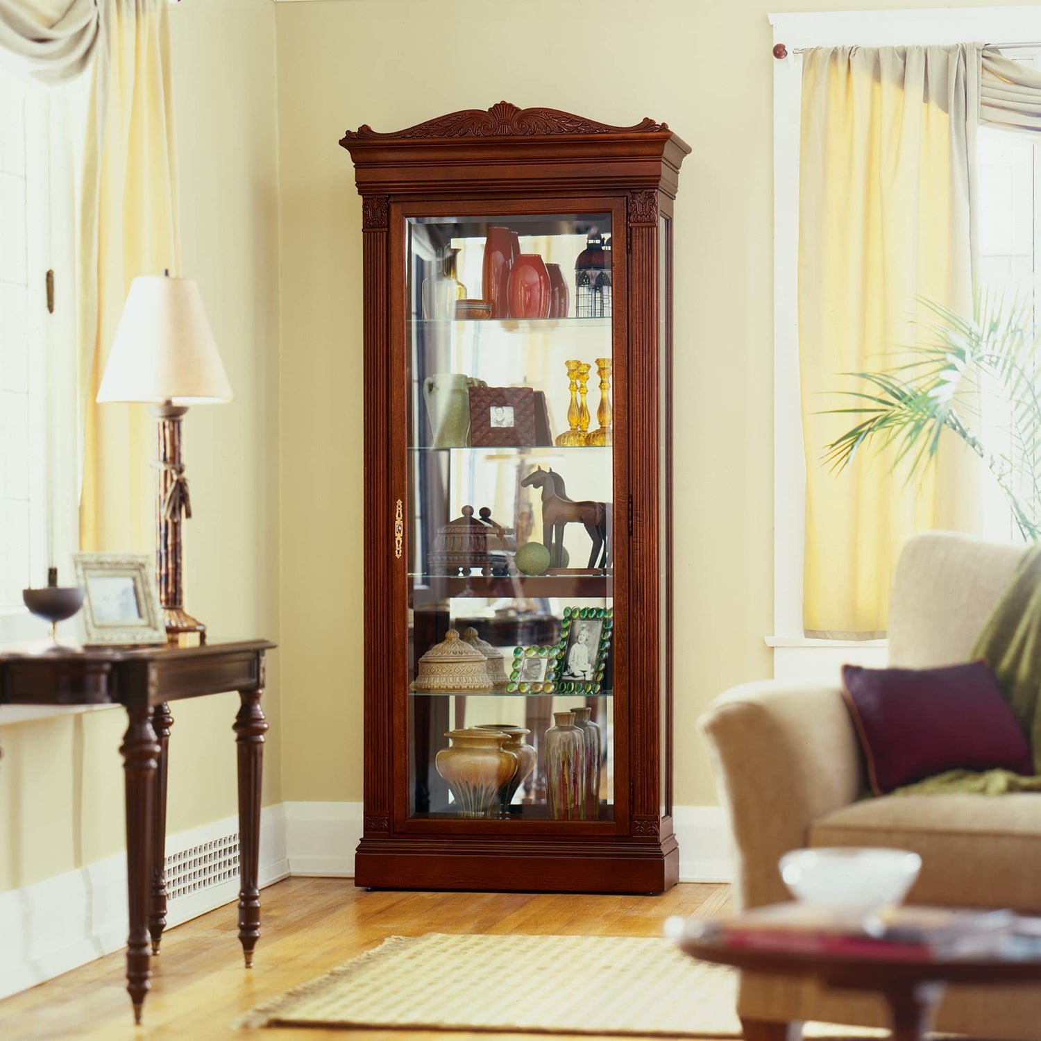 - EXCEPTIONAL MATERIAL QUALITY: Crafted from select hardwoods and veneers, this curio cabinet boasts a lightly distressed finish that adds character and charm. The intricate crowned pediment with detailed leaves and fluted columns showcases expert craftsmanship, making this cabinet not just functional but a piece of art for your space.
