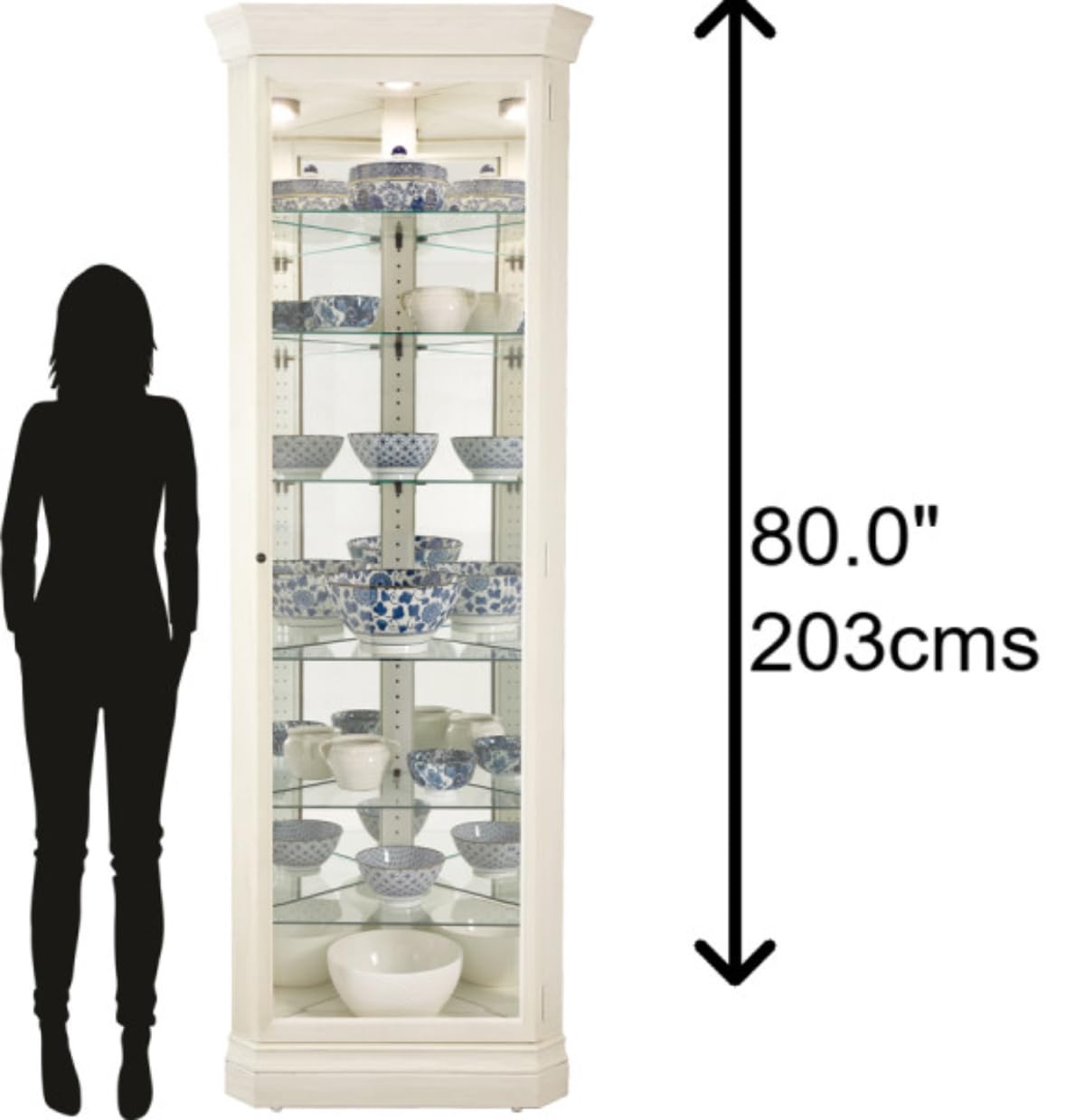 - ILLUMINATED ELEGANCE: Equipped with a No Reach switch for its interior incandescent light, the cabinet adds a warm glow to your collectibles. This lighting enhances visibility & creates an inviting atmosphere, transforming your living or dining area into a showcase of cherished memories and prized possessions.