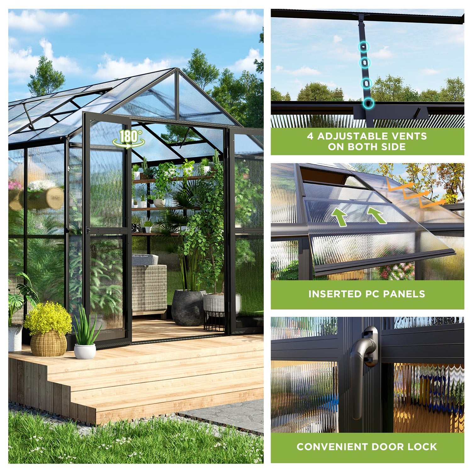 HOWE 8x12x7.5 FT Polycarbonate Greenhouse Double Swing Doors 4 Vents 5.2FT Added Wall Height, Walk-in Large Aluminum Greenhouse Sunroom Winter Greenhouse for Outdoors, Black